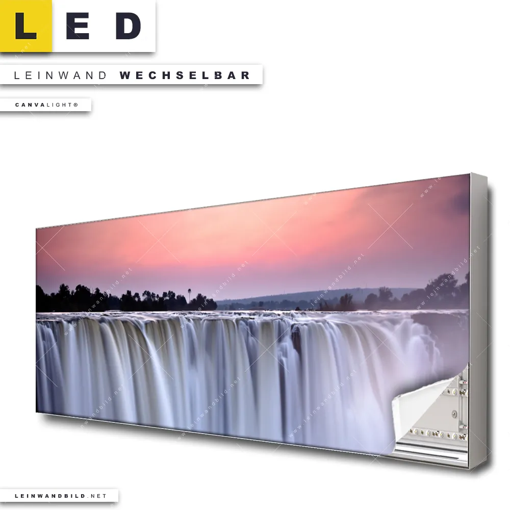 Du bist auf der Suche nach einem Landschaften LED Leinwandbild im Panorama-Format? Begriffe wie Sehenswürdigkeit, Afrika, Wasserfall, Landschaft, Natur haben Dich auf der Suche nach Deinem neuen XXL LED Wandbild mit wechselbarer Leinwand inspiriert? Farben wie Lila, Weiss, Rot, Rosa, Schwarz dürfen auf Deinem neuen extra breiten Leinwand-LED-Bild nicht fehlen und Leuchtbilder im Natürlich - Realistisch Stil passen perfekt zu Deinem Einrichtungsstil?