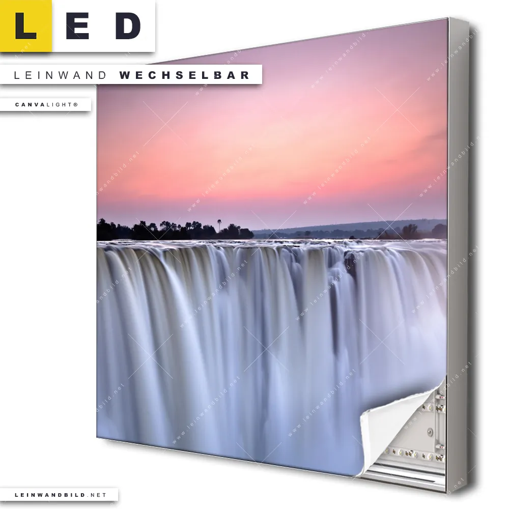 Du bist auf der Suche nach einem Landschaften LED Leinwandbild im Quadratischen Format? Begriffe wie Sehenswürdigkeit, Afrika, Wasserfall, Landschaft, Natur haben Dich auf der Suche nach Deinem neuen XXL LED Wandbild mit wechselbarer Leinwand inspiriert? Farben wie Lila, Weiss, Rot, Rosa, Schwarz dürfen auf Deinem neuen Leinwand-LED-Bild nicht fehlen und Leuchtbilder im Natürlich - Realistisch Stil passen perfekt zu Deinem Einrichtungsstil?
