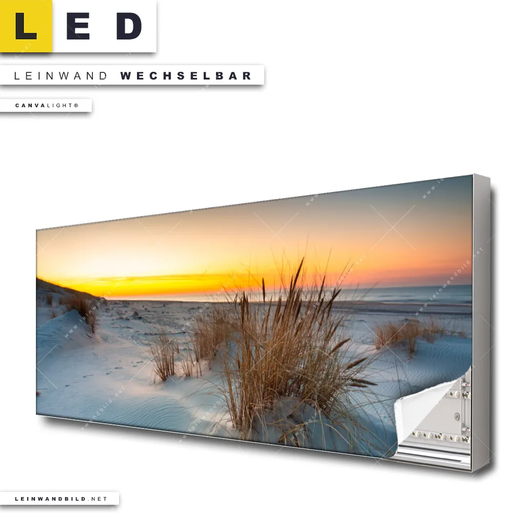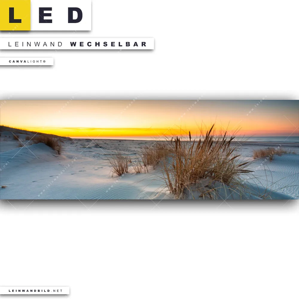 Du bist auf der Suche nach einem Strand - Meer, Landschaften LED Leinwandbild im Panorama-Format? Begriffe wie Deutschland, Sommer, Dünen, Gräser, Sonnenuntergang - Sonnenaufgang, Urlaub - Reisen, Ostsee - Nordsee haben Dich auf der Suche nach Deinem neuen XXL LED Wandbild mit wechselbarer Leinwand inspiriert? Farben wie Blau, Weiss, Orange dürfen auf Deinem neuen extra breiten Leinwand-LED-Bild nicht fehlen und Leuchtbilder im Natürlich - Realistisch Stil passen perfekt zu Deinem Einrichtungsstil?