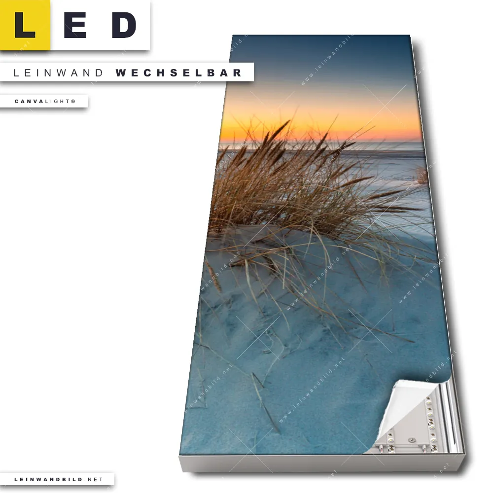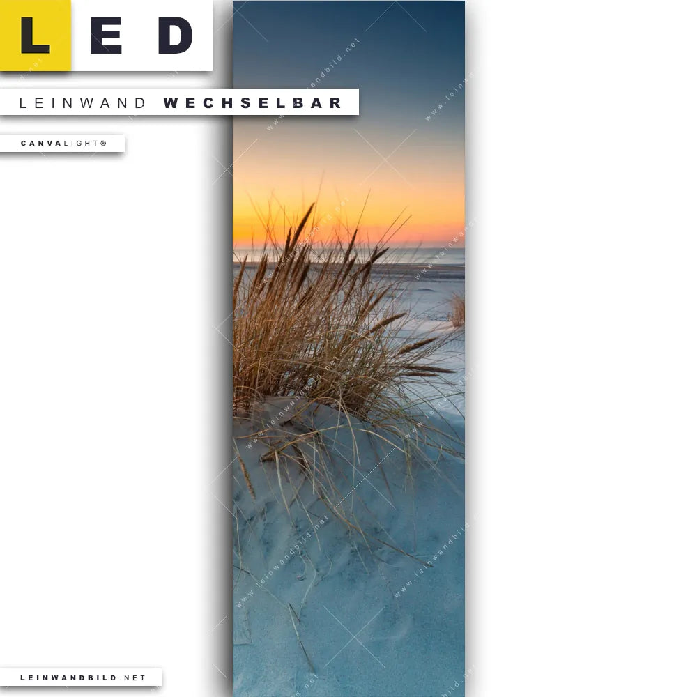 Du bist auf der Suche nach einem Strand - Meer, Landschaften LED Leinwandbild im Schmalen Format? Begriffe wie Deutschland, Sommer, Dünen, Gräser, Sonnenuntergang - Sonnenaufgang, Urlaub - Reisen, Ostsee - Nordsee haben Dich auf der Suche nach Deinem neuen XXL LED Wandbild mit wechselbarer Leinwand inspiriert? Farben wie Blau, Weiss, Orange dürfen auf Deinem neuen Leinwand-LED-Bild im Panorama-Hochformat nicht fehlen und Leuchtbilder im Natürlich - Realistisch Stil passen perfekt zu Deinem Einrichtungsstil?
