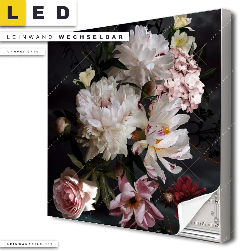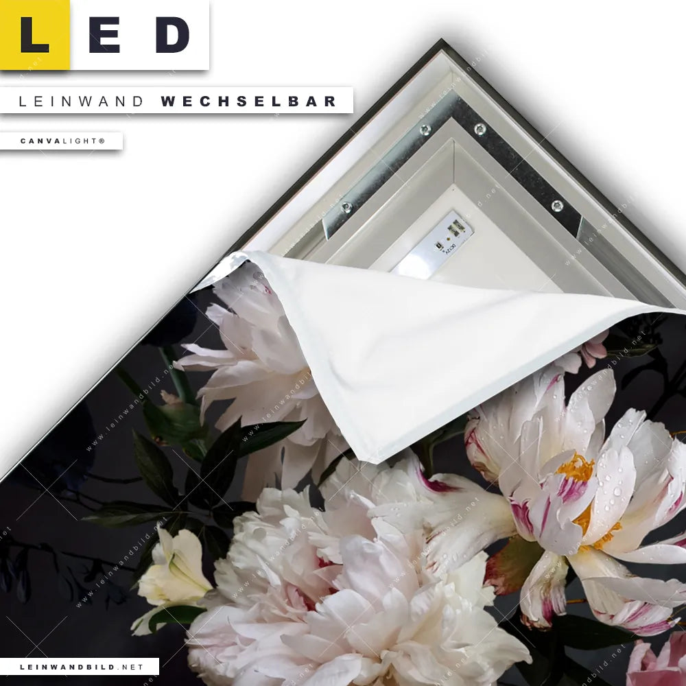 Du konfigurierst Dein individuelles LED Leinwandbild Canvalight® TEX | Weiße Pfingstrosen | Quadrat und wir produzieren es NEU für Dich. Unsere Blumen - Botanik LED Bilder mit wechselbarer Textil-Leinwand sind KEINE Lagerware. Du bist Dir unsicher, welches Motiv oder Format das richtige für dein individuelles Canvalight® Leuchtbild ist, dann helfen wir dir gerne weiter und beraten dich!