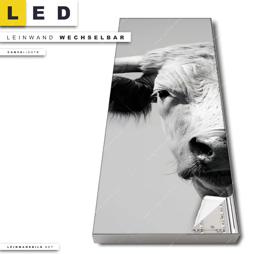 Dann sollte das LED Leinwandbild Canvalight® TEX | Weisser Bulle | Schmal den Weg zu Dir finden. Das stufenlos dimmbare Leinwandbild Majestätischer Bulle im steckerfertigen Leuchtrahmen mit Fernbedienung und optionaler Farbtemperatursteuerung fügt sich als Eye-Catcher harmonisch in jedes Bar - Gastronomie, Wohnzimmer - Schlafzimmer, Büro - Kanzlei, Flur - Eingangsbereich Raumkonzept ein.