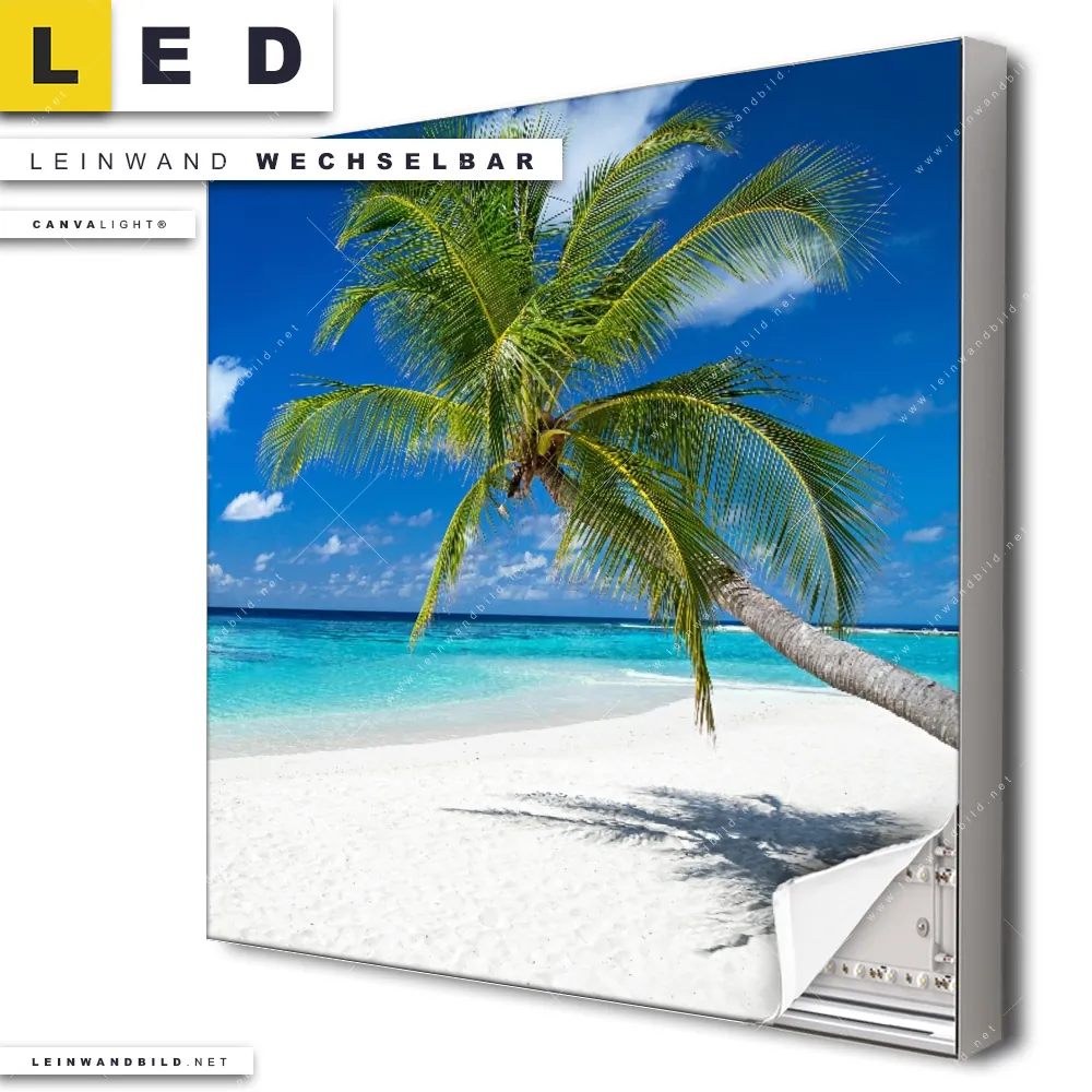 Du konfigurierst Dein individuelles LED Leinwandbild Canvalight® TEX | Weißer Strand & Kokospalme | Quadrat und wir produzieren es NEU für Dich. Unsere Landschaften, Strand - Meer LED Bilder mit wechselbarer Textil-Leinwand sind KEINE Lagerware. Du bist Dir unsicher, welches Motiv oder Format das richtige für dein individuelles Canvalight® Leuchtbild ist, dann helfen wir dir gerne weiter und beraten dich!