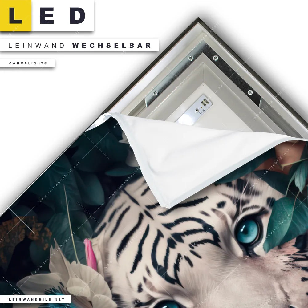 Du konfigurierst Dein individuelles LED Leinwandbild Canvalight® TEX | Weißer Tiger mit blauen Augen zwischen Blumen | Hochformat und wir produzieren es NEU für Dich. Unsere Tierwelt, Blumen - Botanik LED Bilder mit wechselbarer Textil-Leinwand sind KEINE Lagerware. Du bist Dir unsicher, welches Motiv oder Format das richtige für dein individuelles Canvalight® Leuchtbild ist, dann helfen wir dir gerne weiter und beraten dich!
