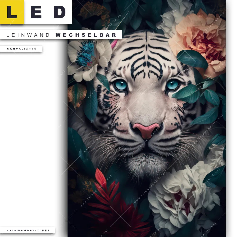 LED Leinwandbild Canvalight® TEX | Weißer Tiger mit blauen Augen zwischen Blumen | Hochformat