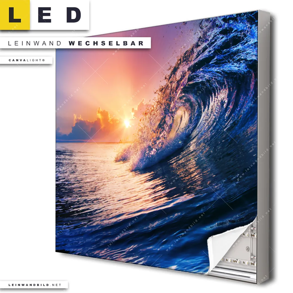 Du konfigurierst Dein individuelles LED Leinwandbild Canvalight® TEX | Welle im Sonnenuntergang | Quadrat und wir produzieren es NEU für Dich. Unsere Landschaften, Strand - Meer LED Bilder mit wechselbarer Textil-Leinwand sind KEINE Lagerware. Du bist Dir unsicher, welches Motiv oder Format das richtige für dein individuelles Canvalight® Leuchtbild ist, dann helfen wir dir gerne weiter und beraten dich!