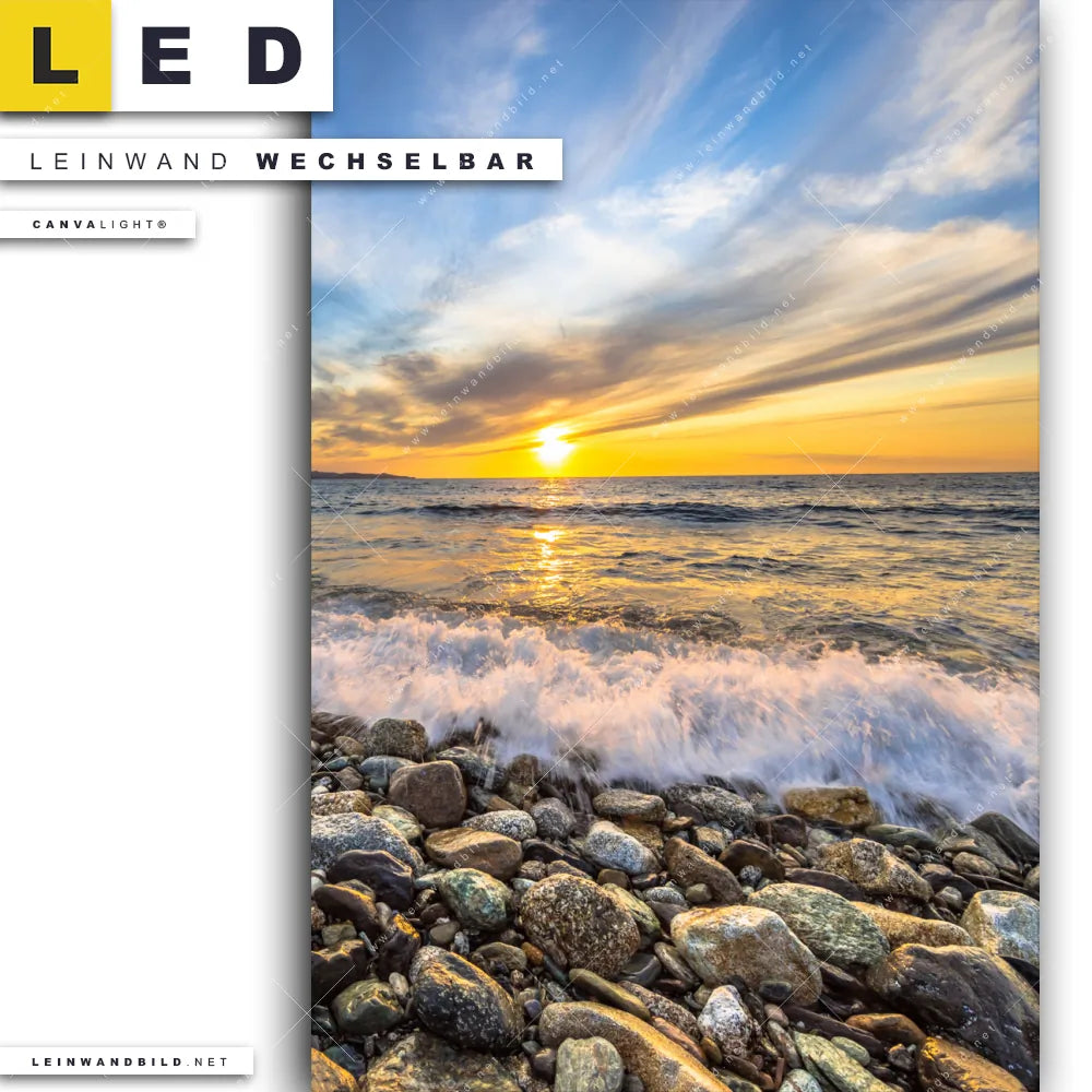 Begriffe wie Küste, Felsen, Sommer, Ostsee - Nordsee, Sonnenuntergang - Sonnenaufgang, Deutschland, Steine, Frühling, Wellen -Surfen haben Dich auf der Suche nach Deinem neuen LED Wandbild mit beleuchteter Leinwand inspiriert? Dann sollte das LED Bild Wellen treffen auf Kiesstrand mit austauschbarer Textil-Fotoleinwand den Weg zu Dir finden.