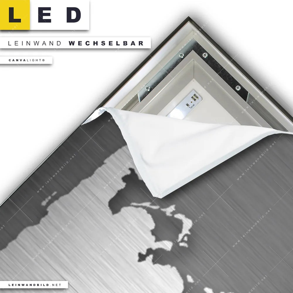 Du konfigurierst Dein individuelles LED Leinwandbild Canvalight® TEX | Weltkarte Edelstahloptik | Panorama und wir produzieren es NEU für Dich. Unsere Karten LED Bilder mit wechselbarer Textil-Leinwand sind KEINE Lagerware. Du bist Dir unsicher, welches Motiv oder Format das richtige für dein individuelles Canvalight® Leuchtbild ist, dann helfen wir dir gerne weiter und beraten dich!