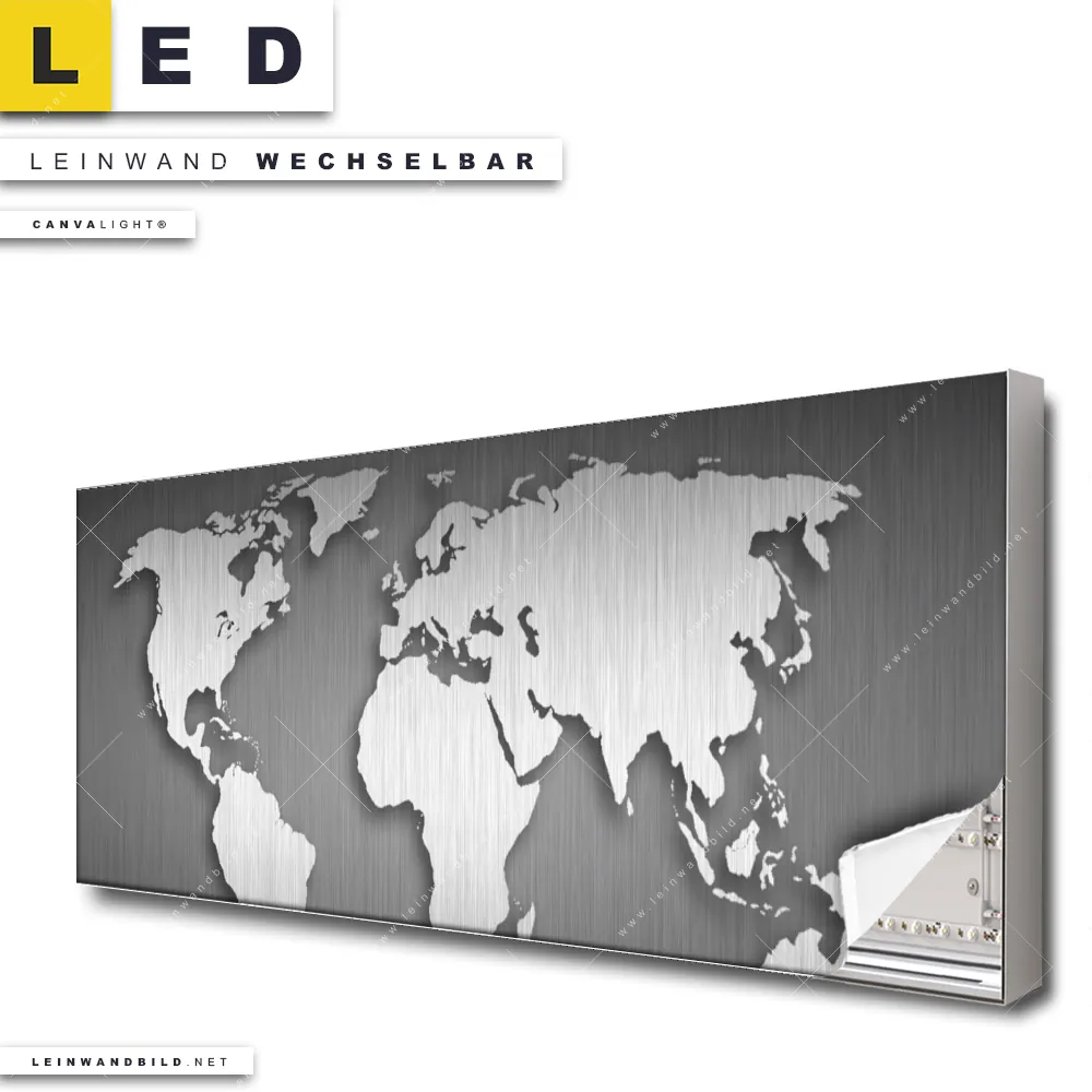 LED Leinwandbild Canvalight® TEX | Weltkarte Edelstahloptik | Panorama
