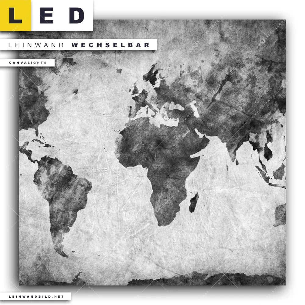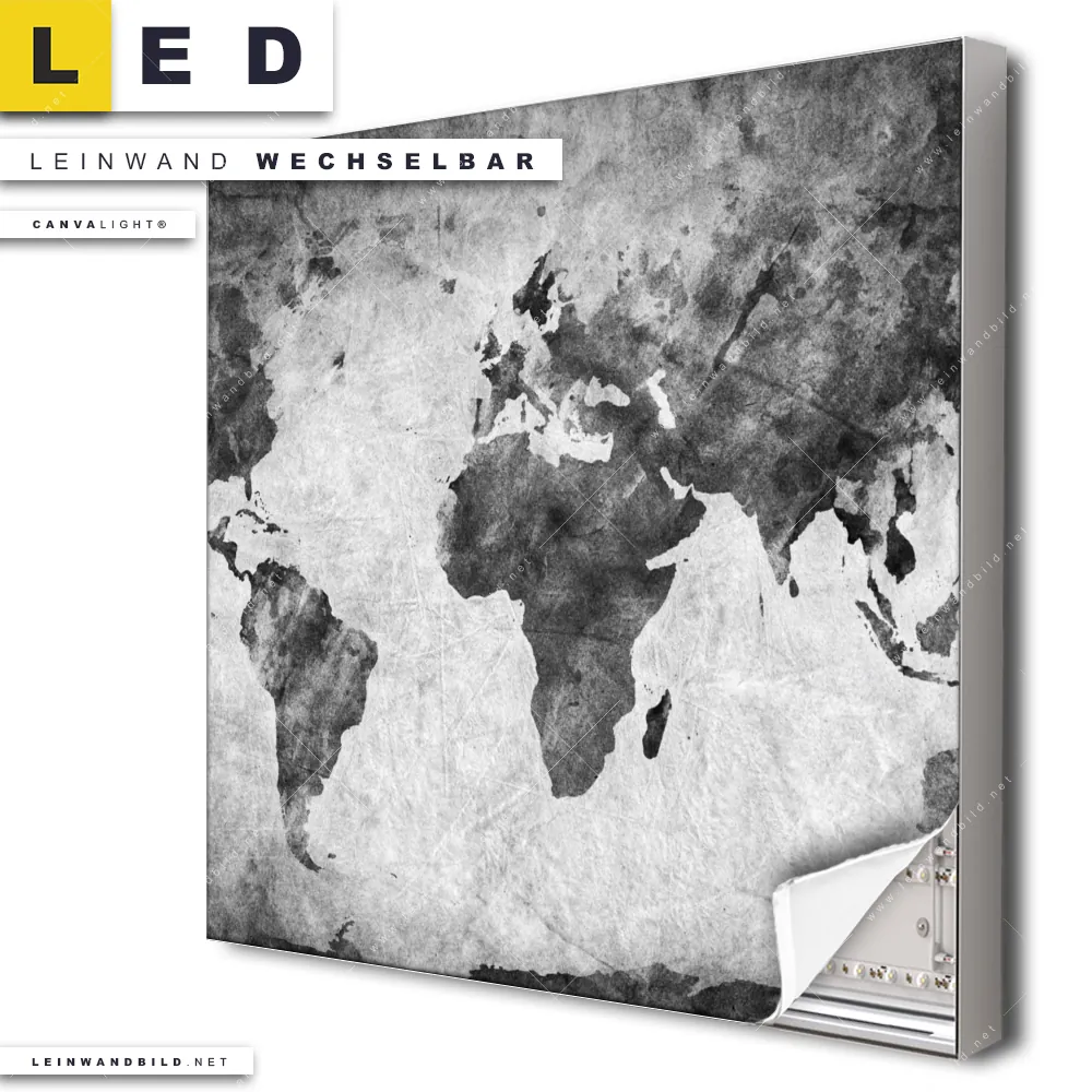 Du bist auf der Suche nach einem Karten LED Leinwandbild im Quadratischen Format? Begriffe wie Weltkarte, Karte, Geografie, World, Map, Reisen, Kontinente, Urlaub, Welt haben Dich auf der Suche nach Deinem neuen XXL LED Wandbild mit wechselbarer Leinwand inspiriert? Farben wie Weiss, Schwarz dürfen auf Deinem neuen Leinwand-LED-Bild nicht fehlen und Leuchtbilder im Abstrakt, Grunge, Retro - Vintage, Schwarz - Weiss Stil passen perfekt zu Deinem Einrichtungsstil?