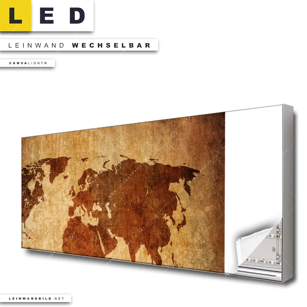 Du bist auf der Suche nach einem Karten LED Leinwandbild im Panorama-Format? Begriffe wie Weltkarte, Karte, Geografie, World, Map, Reisen, Kontinente, Urlaub, Welt haben Dich auf der Suche nach Deinem neuen XXL LED Wandbild mit wechselbarer Leinwand inspiriert? Farben wie Braun, Beige dürfen auf Deinem neuen extra breiten Leinwand-LED-Bild nicht fehlen und Leuchtbilder im Retro - Vintage, Grunge Stil passen perfekt zu Deinem Einrichtungsstil?