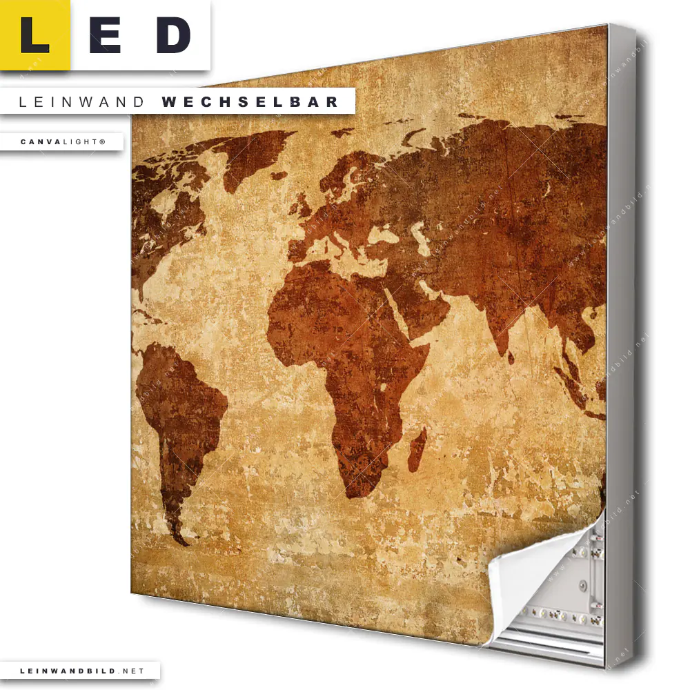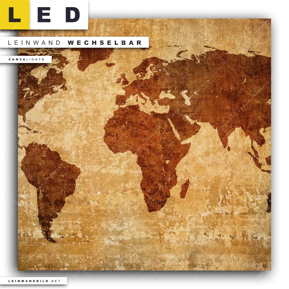 Du bist auf der Suche nach einem Karten LED Leinwandbild im Quadratischen Format? Begriffe wie Weltkarte, Karte, Geografie, World, Map, Reisen, Kontinente, Urlaub, Welt haben Dich auf der Suche nach Deinem neuen XXL LED Wandbild mit wechselbarer Leinwand inspiriert? Farben wie Braun, Beige dürfen auf Deinem neuen Leinwand-LED-Bild nicht fehlen und Leuchtbilder im Retro - Vintage, Grunge Stil passen perfekt zu Deinem Einrichtungsstil?