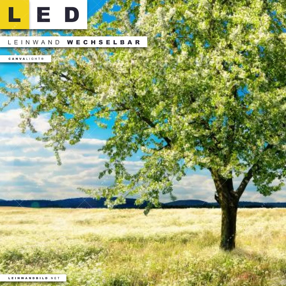 Dann sollte das LED Leinwandbild Canvalight® TEX | Wiese mit blühendem Baum | Querformat den Weg zu Dir finden. Das stufenlos dimmbare Leinwandbild Landschaft im Frühling im steckerfertigen Leuchtrahmen mit Fernbedienung und optionaler Farbtemperatursteuerung fügt sich als Eye-Catcher harmonisch in jedes Büro - Kanzlei, Wohnzimmer - Schlafzimmer Raumkonzept ein.