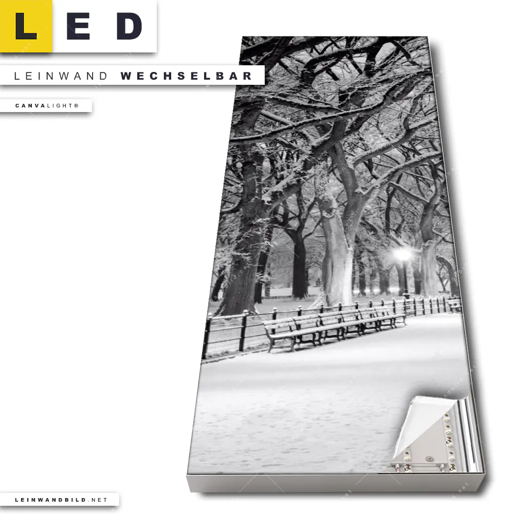 Du konfigurierst Dein individuelles LED Leinwandbild Canvalight® TEX | Wintermorgen im Central Park | Schmal und wir produzieren es NEU für Dich. Unsere Städte - Skylines, Landschaften LED Bilder mit wechselbarer Textil-Leinwand sind KEINE Lagerware. Du bist Dir unsicher, welches Motiv oder Format das richtige für dein individuelles Canvalight® Leuchtbild ist, dann helfen wir dir gerne weiter und beraten dich!
