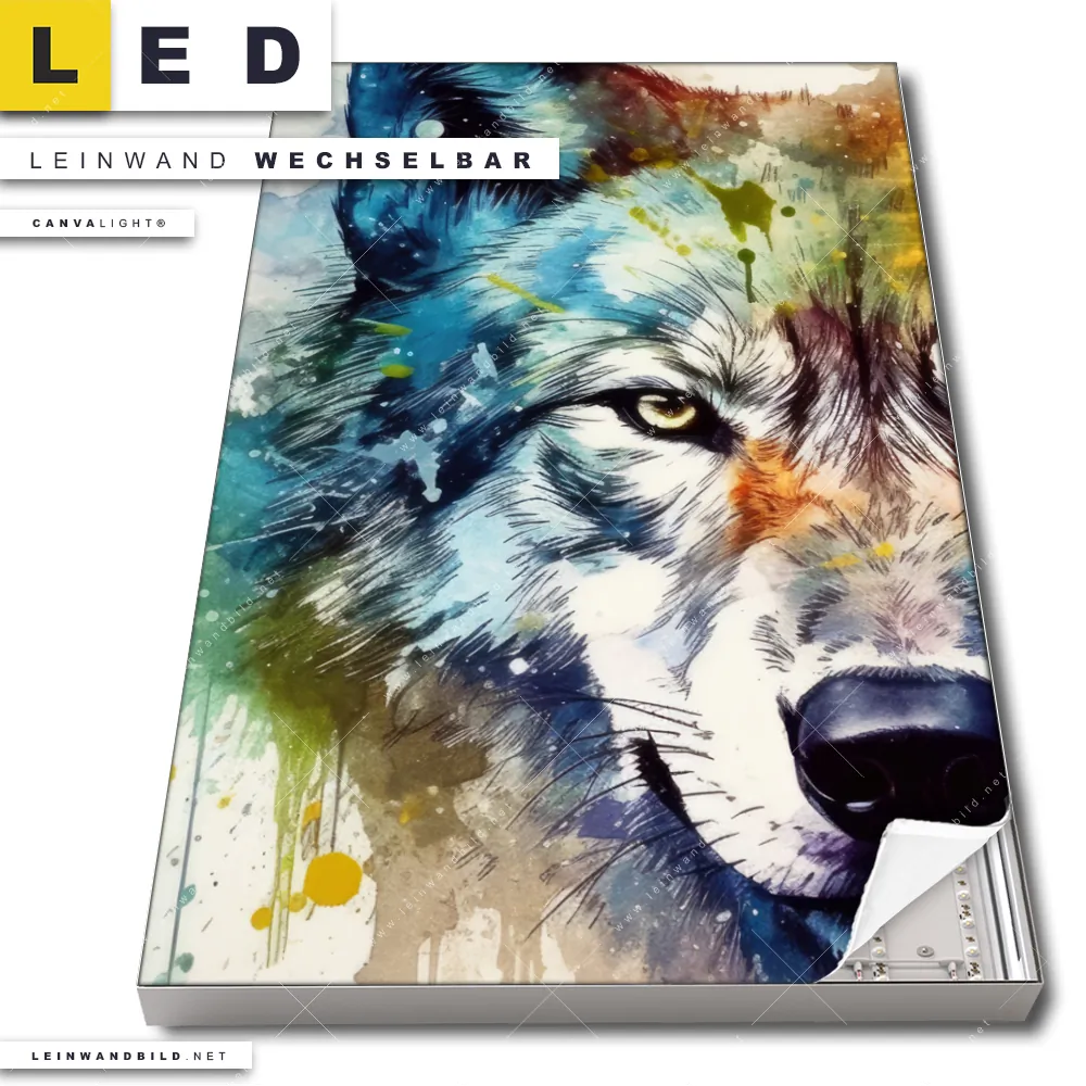 LED Leinwandbild Canvalight® TEX | Wolf mit bunten Farbspritzern No. 2 | Hochformat