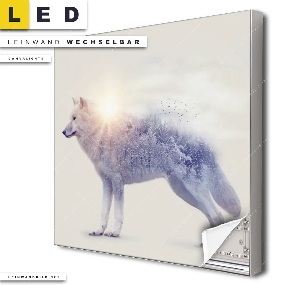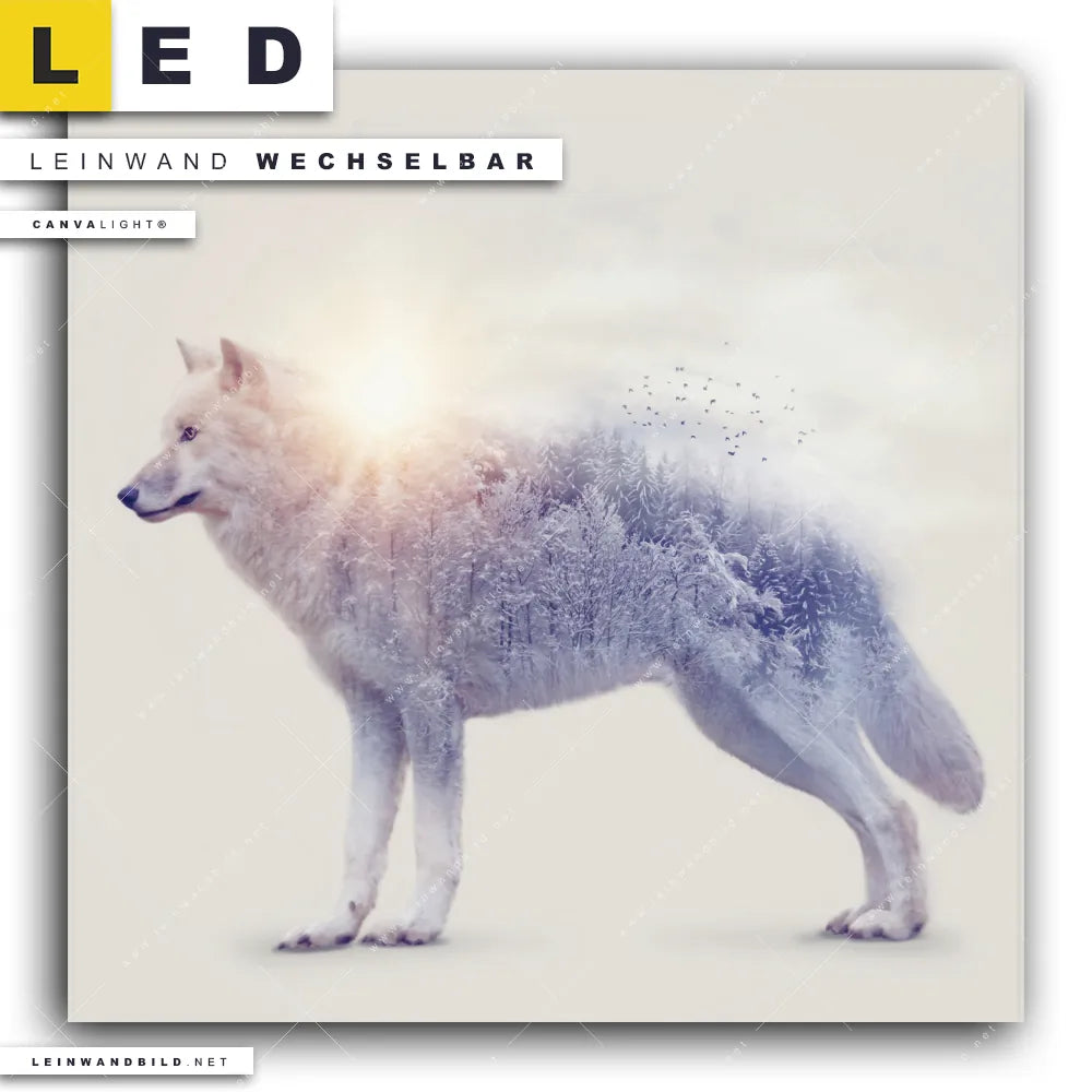 Du bist auf der Suche nach einem Tierwelt LED Leinwandbild im Quadratischen Format? Begriffe wie Wolf, Wald, Doppelbelichtung, Natur, skandinavisch, Bäume, Sonne, Sonnenlicht haben Dich auf der Suche nach Deinem neuen XXL LED Wandbild mit wechselbarer Leinwand inspiriert? Farben wie Beige dürfen auf Deinem neuen Leinwand-LED-Bild nicht fehlen und Leuchtbilder im Modern Art, Mixed Media Stil passen perfekt zu Deinem Einrichtungsstil?