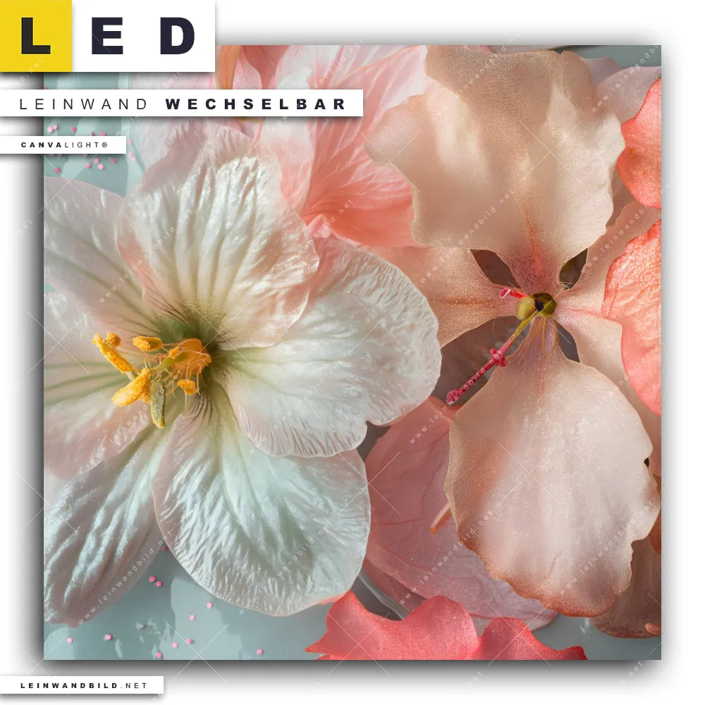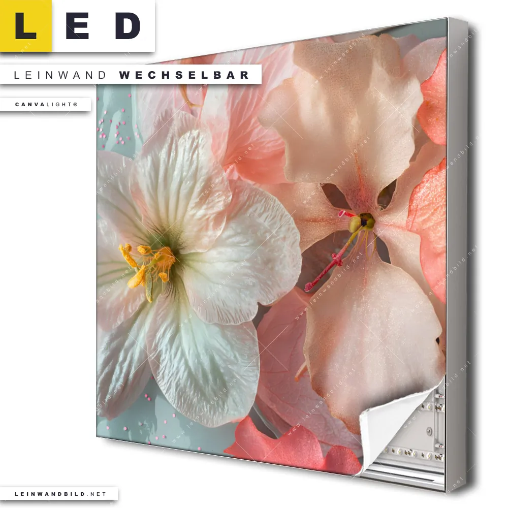 Du bist auf der Suche nach einem Blumen - Botanik LED Leinwandbild im Quadratischen Format? Begriffe wie Blumen, Pflanze, Natur, Blüten, Glitzer, Pastellfarben haben Dich auf der Suche nach Deinem neuen XXL LED Wandbild mit wechselbarer Leinwand inspiriert? Farben wie Rosa, Weiss, Türkis dürfen auf Deinem neuen Leinwand-LED-Bild nicht fehlen und Leuchtbilder im Floral, Natürlich - Realistisch Stil passen perfekt zu Deinem Einrichtungsstil?