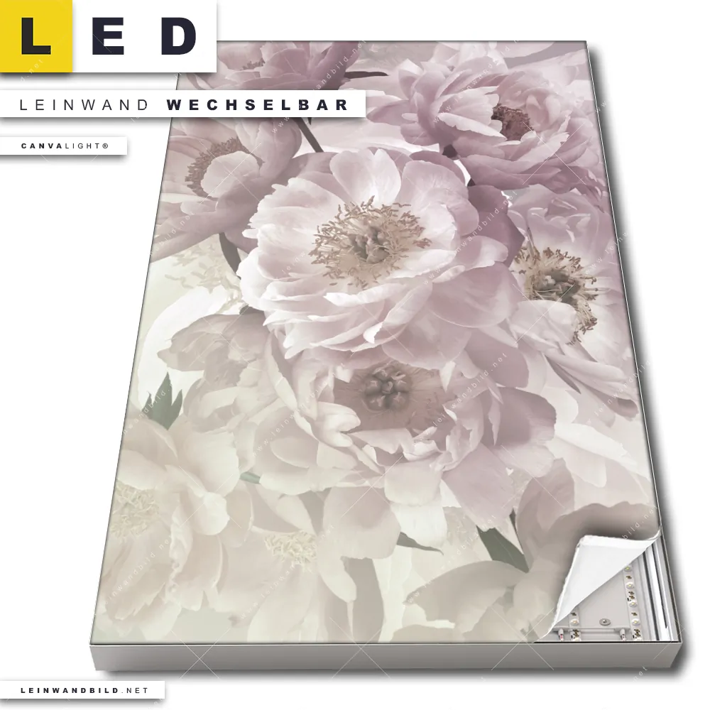 Du bist auf der Suche nach einem Blumen - Botanik LED Leinwandbild im Hochformat? Begriffe wie Pflanze, Natur, Blüte, Nahaufnahme, Draufsicht, vintage, Blumen, pastell, Pfingstrosen, Pastellfarben haben Dich auf der Suche nach Deinem neuen XXL LED Wandbild mit wechselbarer Leinwand inspiriert? Farben wie Rosa, Weiss dürfen auf Deinem neuen Leinwand-LED-Bild nicht fehlen und Leuchtbilder im Floral, Natürlich - Realistisch, Retro - Vintage Stil passen perfekt zu Deinem Einrichtungsstil?