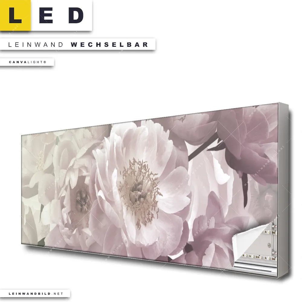 Du bist auf der Suche nach einem Blumen - Botanik LED Leinwandbild im Panorama-Format? Begriffe wie Pflanze, Natur, Blüte, Nahaufnahme, Draufsicht, vintage, Blumen, pastell, Pfingstrosen, Pastellfarben haben Dich auf der Suche nach Deinem neuen XXL LED Wandbild mit wechselbarer Leinwand inspiriert? Farben wie Rosa, Weiss dürfen auf Deinem neuen extra breiten Leinwand-LED-Bild nicht fehlen und Leuchtbilder im Floral, Natürlich - Realistisch, Retro - Vintage Stil passen perfekt zu Deinem Einrichtungsstil?