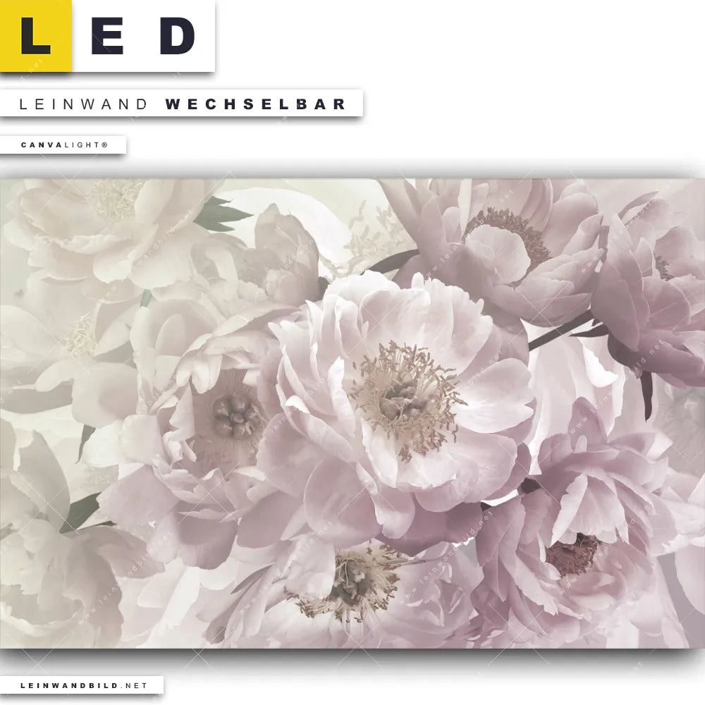 Du bist auf der Suche nach einem Blumen - Botanik LED Leinwandbild im Querformat? Begriffe wie Pflanze, Natur, Blüte, Nahaufnahme, Draufsicht, vintage, Blumen, pastell, Pfingstrosen, Pastellfarben haben Dich auf der Suche nach Deinem neuen XXL LED Wandbild mit wechselbarer Leinwand inspiriert? Farben wie Rosa, Weiss dürfen auf Deinem neuen breiten Leinwand-LED-Bild nicht fehlen und Leuchtbilder im Floral, Natürlich - Realistisch, Retro - Vintage Stil passen perfekt zu Deinem Einrichtungsstil?
