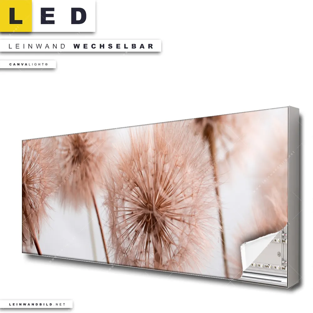 Du bist auf der Suche nach einem Blumen - Botanik LED Leinwandbild im Panorama-Format? Begriffe wie Blume, Botanik, Pflanze, Natur, Nahaufnahme, Pusteblume, Dandelion haben Dich auf der Suche nach Deinem neuen XXL LED Wandbild mit wechselbarer Leinwand inspiriert? Farben wie Beige, Weiss, Rosa dürfen auf Deinem neuen extra breiten Leinwand-LED-Bild nicht fehlen und Leuchtbilder im Minimalistisch, Retro - Vintage Stil passen perfekt zu Deinem Einrichtungsstil?