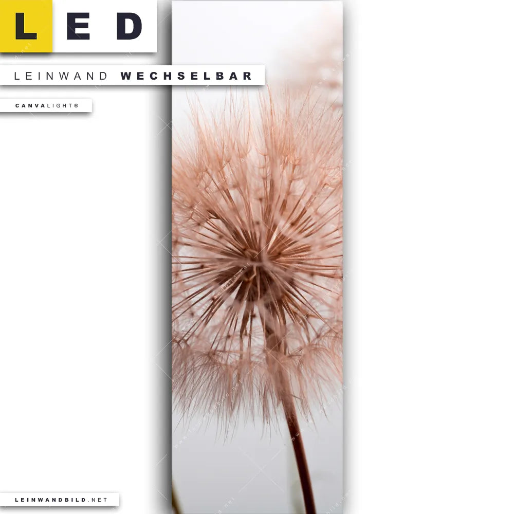 Du bist auf der Suche nach einem Blumen - Botanik LED Leinwandbild im Schmalen Format? Begriffe wie Blume, Botanik, Pflanze, Natur, Nahaufnahme, Pusteblume, Dandelion haben Dich auf der Suche nach Deinem neuen XXL LED Wandbild mit wechselbarer Leinwand inspiriert? Farben wie Beige, Weiss, Rosa dürfen auf Deinem neuen Leinwand-LED-Bild im Panorama-Hochformat nicht fehlen und Leuchtbilder im Minimalistisch, Retro - Vintage Stil passen perfekt zu Deinem Einrichtungsstil?