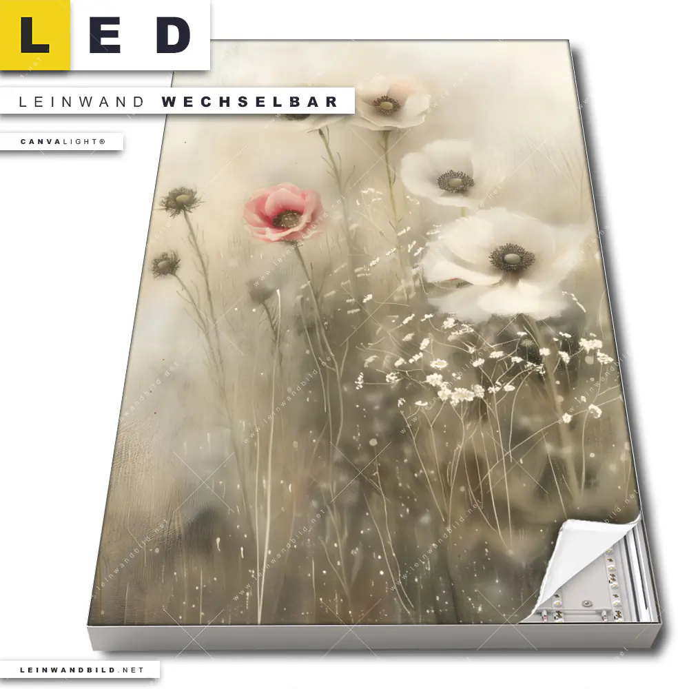 Du konfigurierst Dein individuelles LED Leinwandbild Canvalight® TEX | Zarte Wildblumen in Pastelltönen | Hochformat und wir produzieren es NEU für Dich. Unsere Blumen - Botanik, Landschaften LED Bilder mit wechselbarer Textil-Leinwand sind KEINE Lagerware. Du bist Dir unsicher, welches Motiv oder Format das richtige für dein individuelles Canvalight® Leuchtbild ist, dann helfen wir dir gerne weiter und beraten dich!