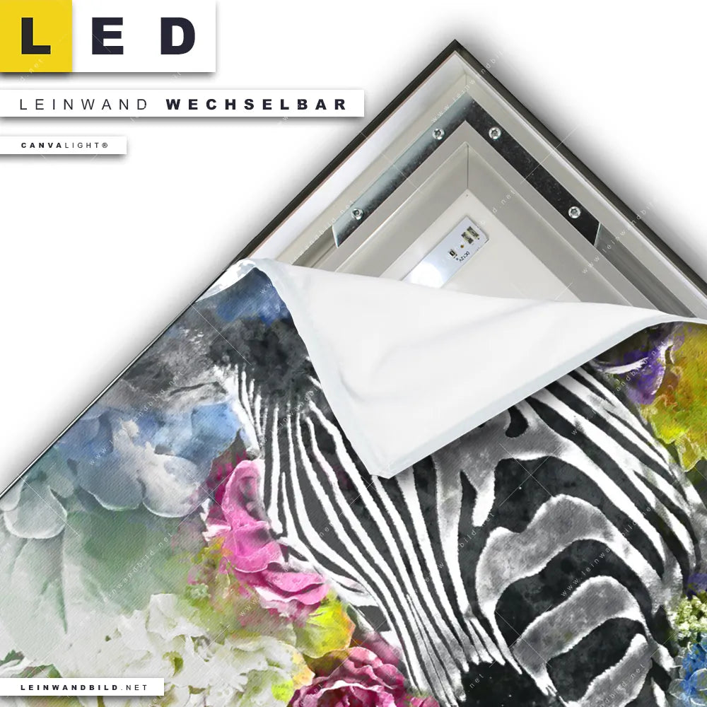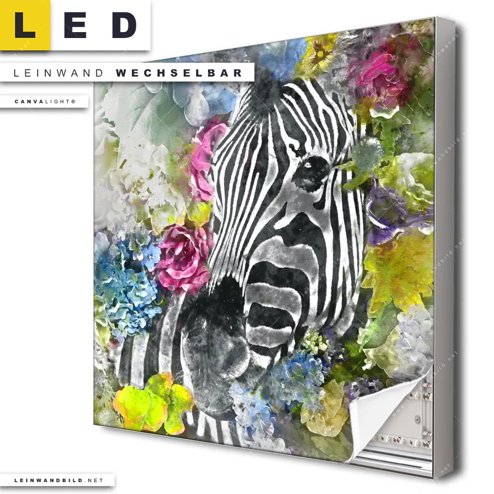 Dann sollte das LED Leinwandbild Canvalight® TEX | Zebra & Blumen | Quadrat den Weg zu Dir finden. Das stufenlos dimmbare Leinwandbild Florale Wildnis im steckerfertigen Leuchtrahmen mit Fernbedienung und optionaler Farbtemperatursteuerung fügt sich als Eye-Catcher harmonisch in jedes Wohnzimmer - Schlafzimmer, Arzt - Praxis, Bar - Gastronomie, Büro - Kanzlei, Flur - Eingangsbereich Raumkonzept ein.