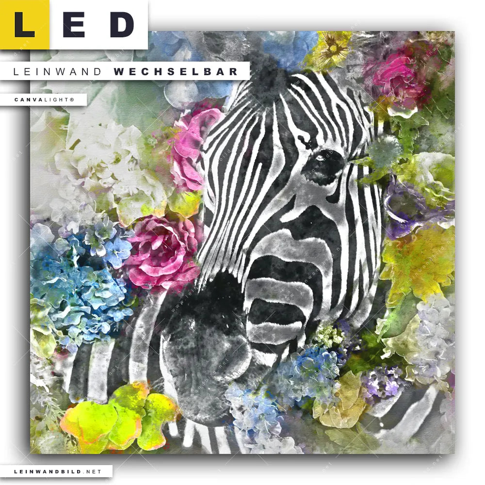 Du bist auf der Suche nach einem Tierwelt, Blumen - Botanik LED Leinwandbild im Quadratischen Format? Begriffe wie Tiere & Blumen, Tier, Blumen, Zebra, Kunst, Aquarell, Blüten haben Dich auf der Suche nach Deinem neuen XXL LED Wandbild mit wechselbarer Leinwand inspiriert? Farben wie Weiss, Schwarz, Blau, Grün, Hellgrün, Hellblau, Rosa, Mint, Lila, Grau dürfen auf Deinem neuen Leinwand-LED-Bild nicht fehlen und Leuchtbilder im Floral, Modern Art Stil passen perfekt zu Deinem Einrichtungsstil?