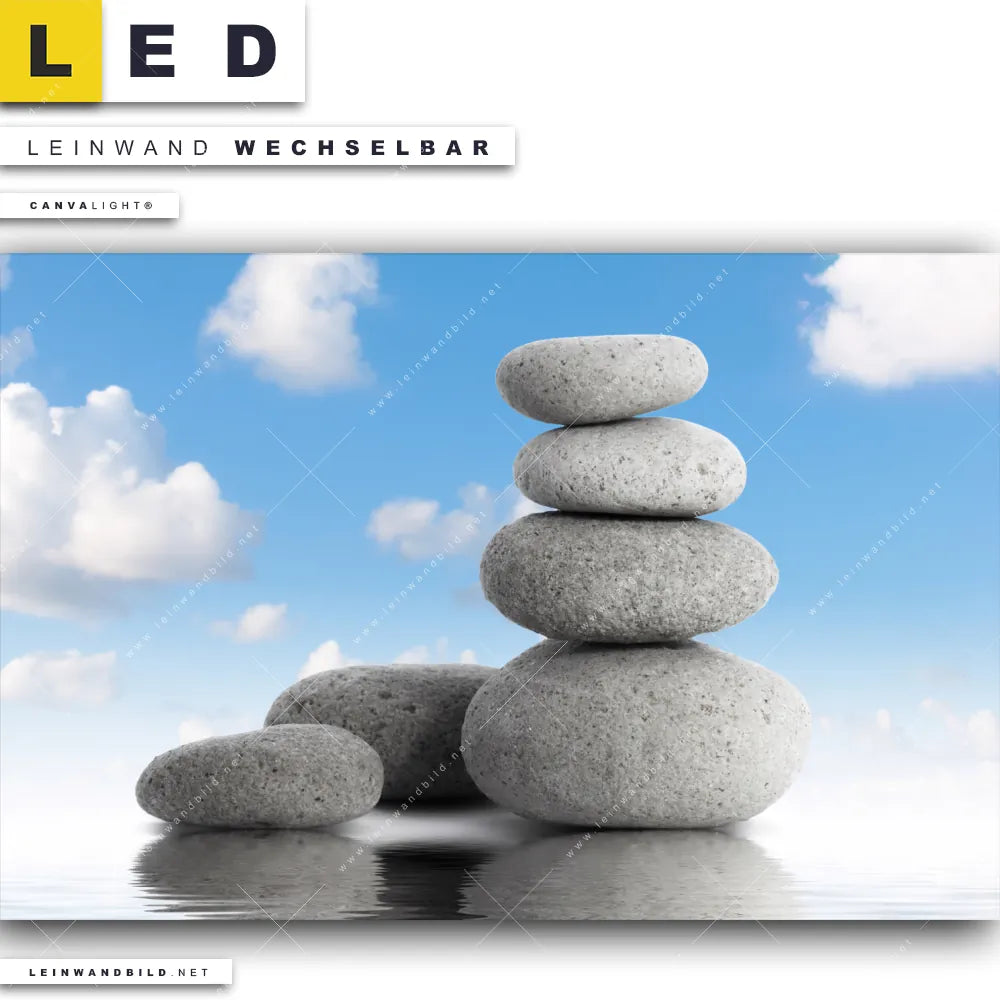 Du bist auf der Suche nach einem Buddha - Feng Shui LED Leinwandbild im Querformat? Begriffe wie Buddhismus, Religion, Feng Shui, Zen, Meditation, Steine, Zensteine, Himmel Wolken, Turm, gestapelt, Wasser, Spiegelung, Wasserspiegelung haben Dich auf der Suche nach Deinem neuen XXL LED Wandbild mit wechselbarer Leinwand inspiriert? Farben wie Blau, Weiss, Hellblau dürfen auf Deinem neuen breiten Leinwand-LED-Bild nicht fehlen und Leuchtbilder im Mixed Media, Modern Art Stil passen perfekt zu Deinem Einrichtungsstil?