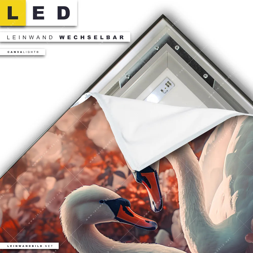 Dann sollte das LED Leinwandbild Canvalight® TEX | Zwei Schwäne im Wasser | Quadrat den Weg zu Dir finden. Das stufenlos dimmbare Leinwandbild Zwei liebende Schwäne im steckerfertigen Leuchtrahmen mit Fernbedienung und optionaler Farbtemperatursteuerung fügt sich als Eye-Catcher harmonisch in jedes Wohnzimmer - Schlafzimmer, Arzt - Praxis, Büro - Kanzlei, Flur - Eingangsbereich Raumkonzept ein.