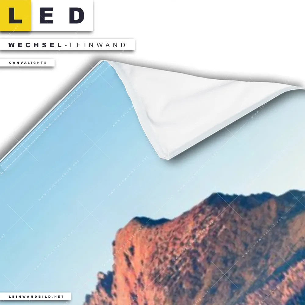 LED Wechsel-Leinwand Canvalight® TEX | Abendszene mit Bergen und See | Schmal