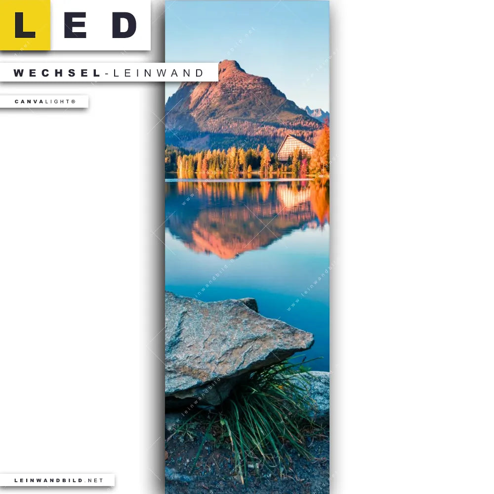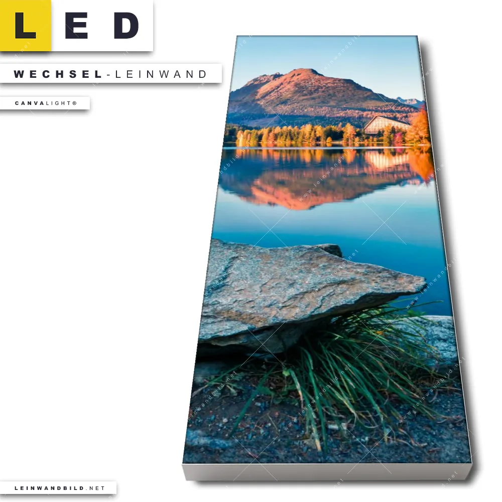 Du bist auf der Suche nach einer Landschaften Wechsel-Leinwand für Dein LED-Leinwandbild im Schmalen Format? Begriffe wie Wasserspiegelung, Bergsee, Gebirge, Berge, Slowakei, Bäume, Steine, See, Wasser, Natur, Reisen, Urlaub haben Dich auf der Suche nach Deiner Ersatz-Leinwand für dein LED Wandbild im Panorama-Hochformat mit wechselbarer Leinwand inspiriert? Farben wie Braun, Blau, Beige dürfen auf Deinem neuen Wechselmotiv für Dein XXL Leinwand-LED-Bild nicht fehlen und Leinwände im Natürlich - Realistisch Stil für Leuchtbilder passen perfekt zu Deinem Einrichtungsstil?