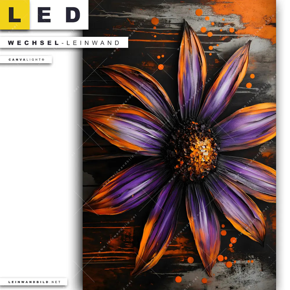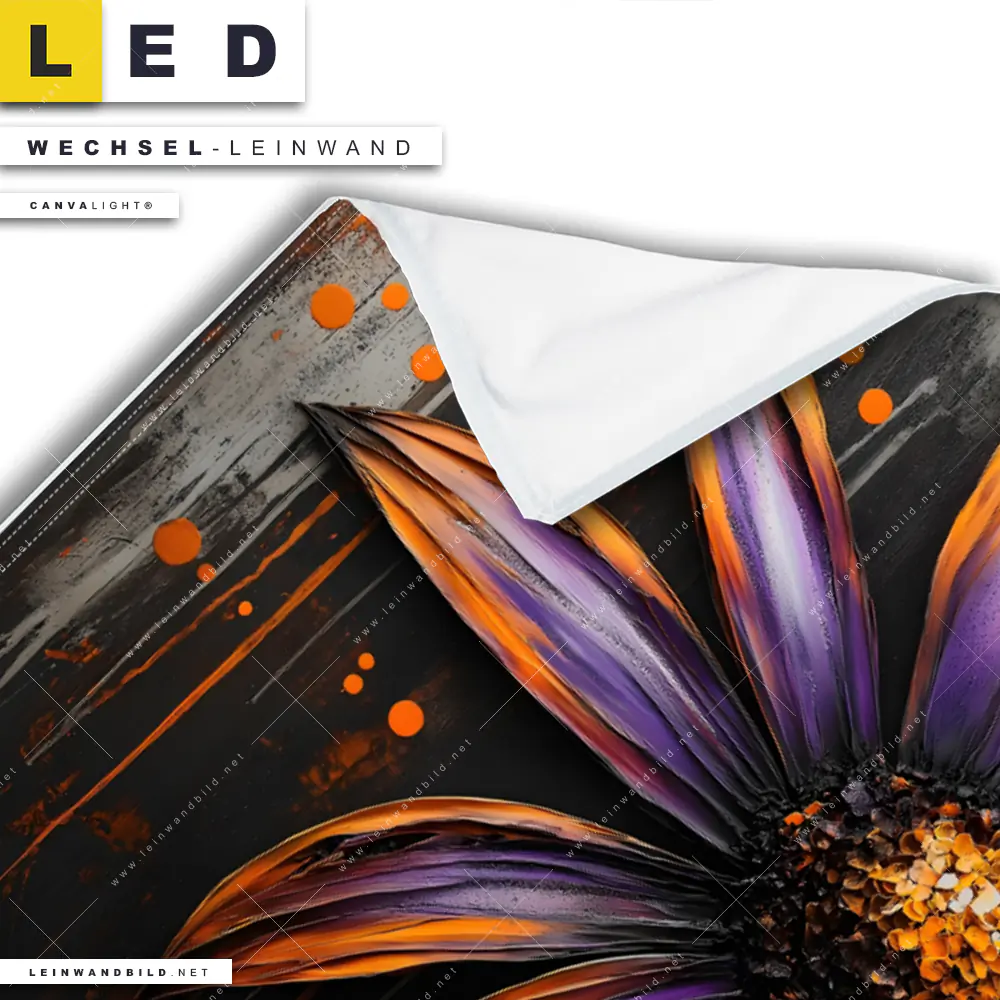 LED Wechsel-Leinwand Canvalight® TEX | Abstrakte Blume in Orange & Lila | Hochformat