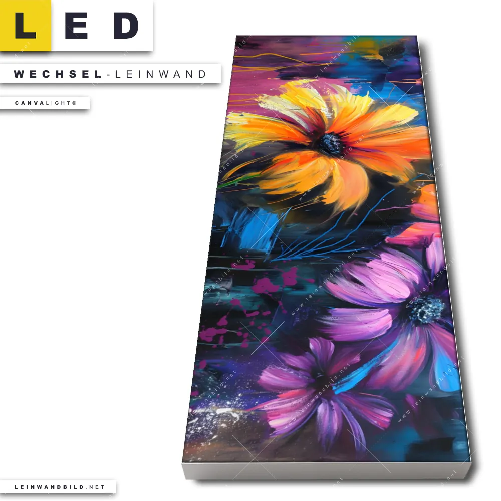 Du konfigurierst Deine individuelle LED Wechsel-Leinwand Canvalight® TEX | Abstrakte Blumenpracht | Schmal und wir produzieren sie NEU für Dich. Unsere Blumen - Botanik Austausch-Fotoleinwände für Canvalight® LED Bilder sind KEINE Lagerware. Du bist Dir unsicher, welches Motiv oder Format das richtige für dein individuelles LED Wechselmotiv auf Leinwand ist, dann helfen wir dir gerne weiter und beraten dich!