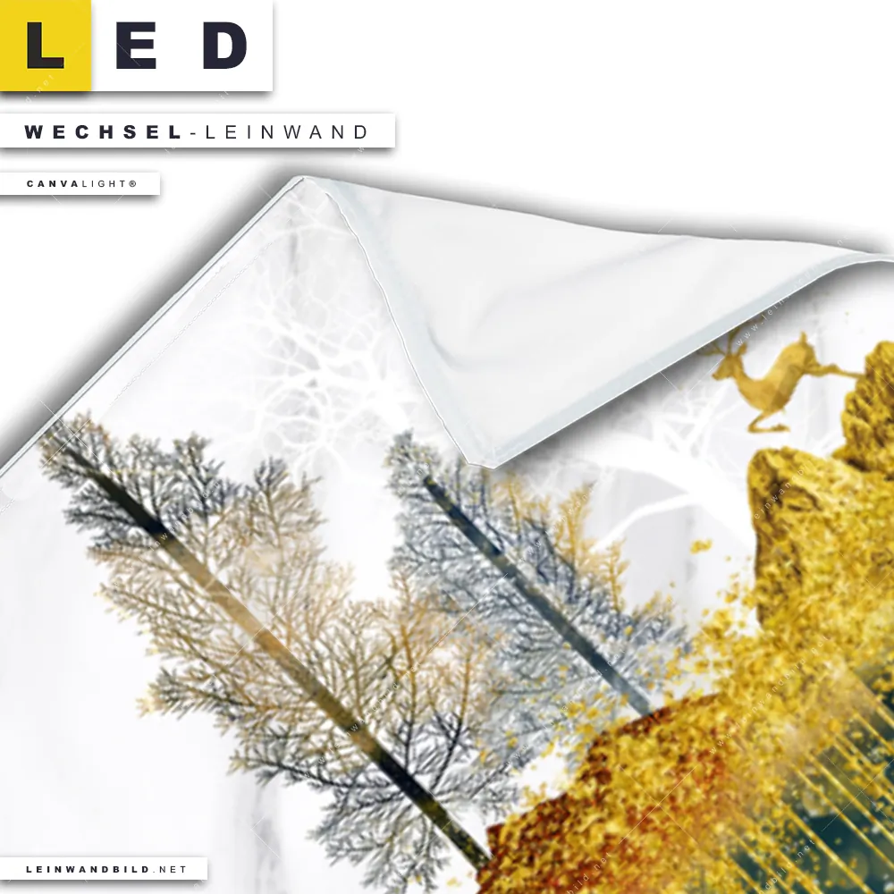 Bitte beachte, dass die Farben, der auf dem Monitor abgebildeten Hirsche in Gold im Wald Darstellung, möglicherweise von den Originalfarben deiner Canvalight® TEX Wechsel-Leinwand abweichen können.