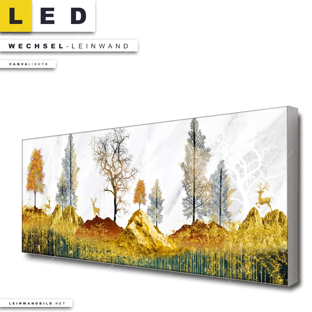 Du bist auf der Suche nach einer Landschaften Wechsel-Leinwand für Dein LED-Leinwandbild im Panorama-Format? Begriffe wie Abstrakt, Modern, Kunst, Landschaft, Bäume, Tiere, Wald, Hirsch, Rotwild, Berge haben Dich auf der Suche nach Deiner Ersatz-Leinwand für dein extra breites LED Wandbild mit wechselbarer Leinwand inspiriert? Farben wie Weiss, Schwarz, Beige, Gold, Ocker, Orange dürfen auf Deinem neuen Wechselmotiv für Dein XXL Leinwand-LED-Bild nicht fehlen und Leinwände im Abstrakt, Modern Art Stil für Leuchtbilder passen perfekt zu Deinem Einrichtungsstil?