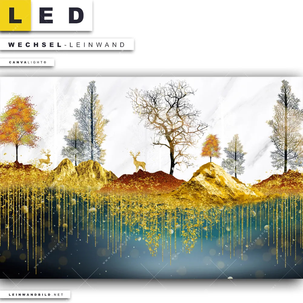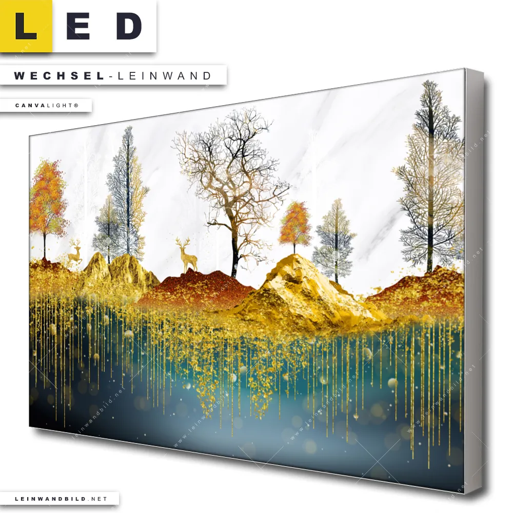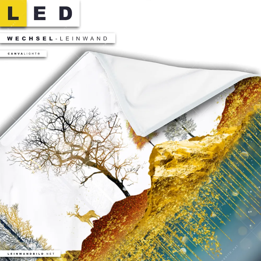 Du bist auf der Suche nach einer Landschaften Wechsel-Leinwand für Dein LED-Leinwandbild im Querformat? Begriffe wie Abstrakt, Modern, Kunst, Landschaft, Bäume, Tiere, Wald, Hirsch, Rotwild, Berge haben Dich auf der Suche nach Deiner Ersatz-Leinwand für dein breites LED Wandbild mit wechselbarer Leinwand inspiriert? Farben wie Weiss, Schwarz, Beige, Gold, Ocker, Orange dürfen auf Deinem neuen Wechselmotiv für Dein XXL Leinwand-LED-Bild nicht fehlen und Leinwände im Abstrakt, Modern Art Stil für Leuchtbilder passen perfekt zu Deinem Einrichtungsstil?