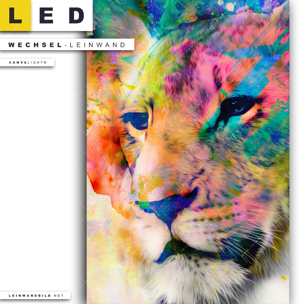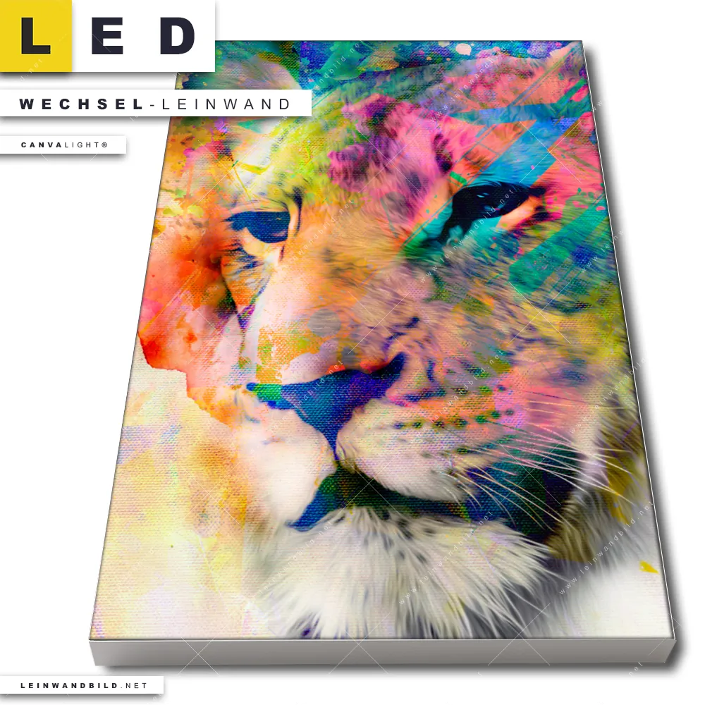 Du bist auf der Suche nach einer Tierwelt Wechsel-Leinwand für Dein LED-Leinwandbild im Hochformat? Begriffe wie Raubkatze, Löwe, Afrika, Dschungel, Lion, Farbspritzer, Farbexplosion, Farbe, Porträt, Löwin haben Dich auf der Suche nach Deiner Ersatz-Leinwand für dein LED Wandbild mit wechselbarer Leinwand inspiriert? Farben wie Bunt dürfen auf Deinem neuen Wechselmotiv für Dein XXL Leinwand-LED-Bild nicht fehlen und Leinwände im Abstrakt, Modern Art, Pop Art, Street Art Stil für Leuchtbilder passen perfekt zu Deinem Einrichtungsstil?