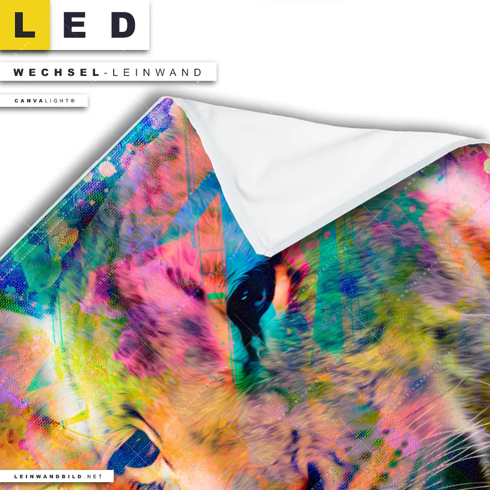 Du konfigurierst Deine individuelle LED Wechsel-Leinwand Canvalight® TEX | Abstrakte Löwin | Quadrat und wir produzieren sie NEU für Dich. Unsere Tierwelt Austausch-Fotoleinwände für Canvalight® LED Bilder sind KEINE Lagerware. Du bist Dir unsicher, welches Motiv oder Format das richtige für dein individuelles LED Wechselmotiv auf Leinwand ist, dann helfen wir dir gerne weiter und beraten dich!