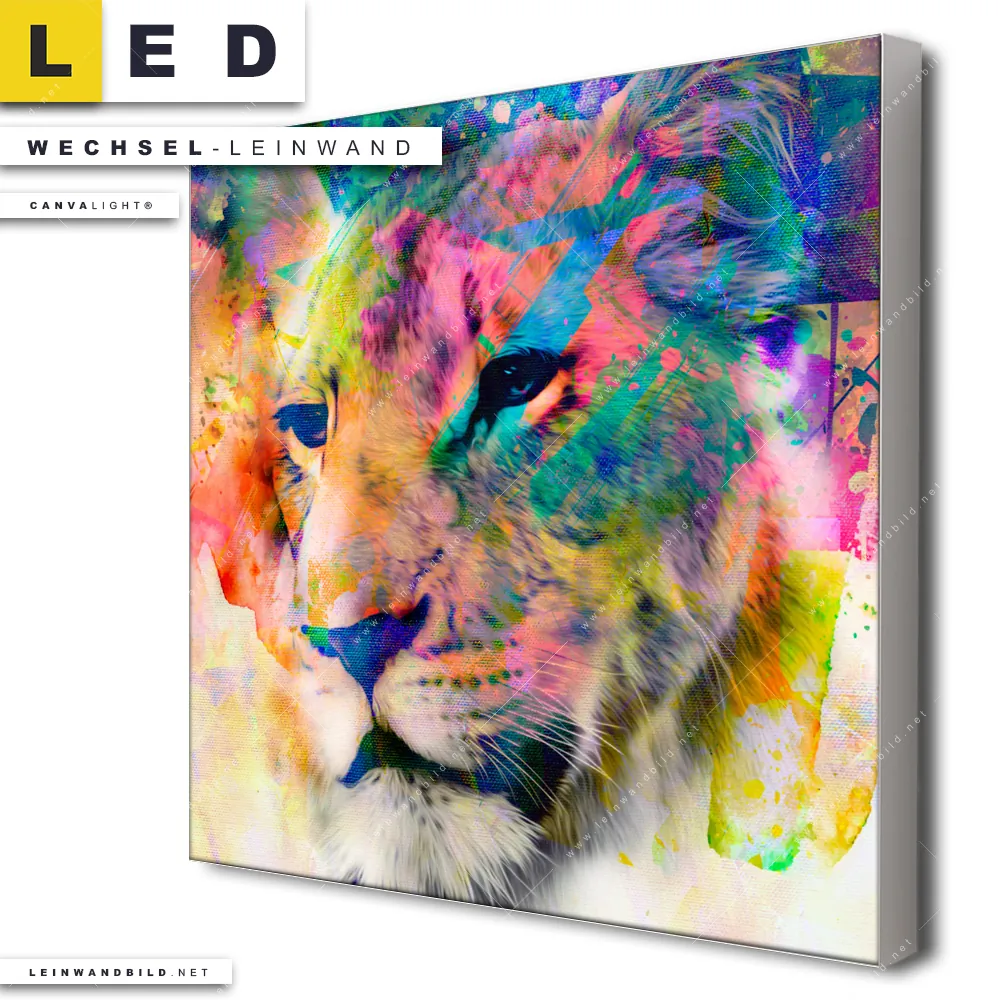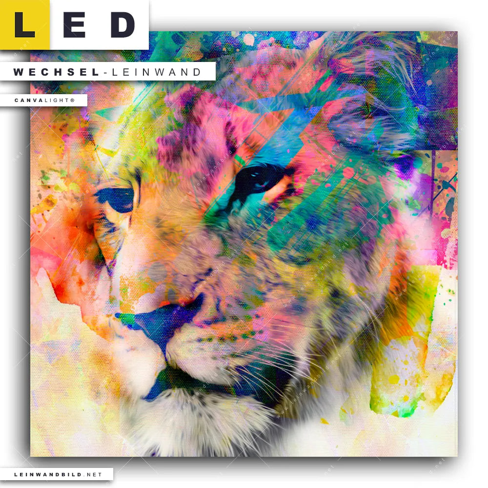 Du bist auf der Suche nach einer Tierwelt Wechsel-Leinwand für Dein LED-Leinwandbild im Quadratischen Format? Begriffe wie Raubkatze, Löwe, Afrika, Dschungel, Lion, Farbspritzer, Farbexplosion, Farbe, Porträt, Löwin haben Dich auf der Suche nach Deiner Ersatz-Leinwand für dein LED Wandbild mit wechselbarer Leinwand inspiriert? Farben wie Bunt dürfen auf Deinem neuen Wechselmotiv für Dein XXL Leinwand-LED-Bild nicht fehlen und Leinwände im Abstrakt, Modern Art, Pop Art, Street Art Stil für Leuchtbilder passen perfekt zu Deinem Einrichtungsstil?