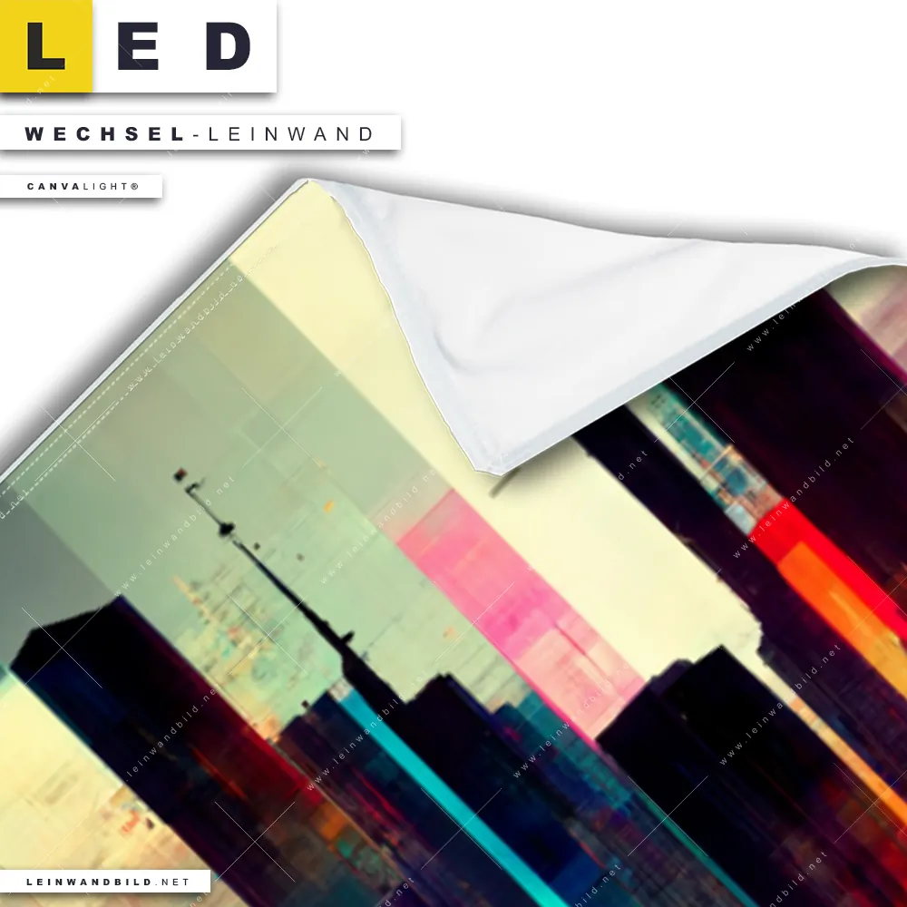 Dann sollte die Wechsel-Leinwand Canvalight® TEX | Abstrakte Skyline No.3 | Panorama den Weg zu Dir finden. Die Austausch-Leinwand City vor buntem Hintergrund - passend für unsere stufenlos dimmbaren, steckerfertigen Leinwandbilder im LED Leuchtrahmen mit Fernbedienung und optionaler Farbtemperatursteuerung - fügt sich als Eye-Catcher harmonisch in jedes Bar - Gastronomie, Arzt - Praxis, Büro - Kanzlei, Wohnzimmer - Schlafzimmer Raumkonzept ein.