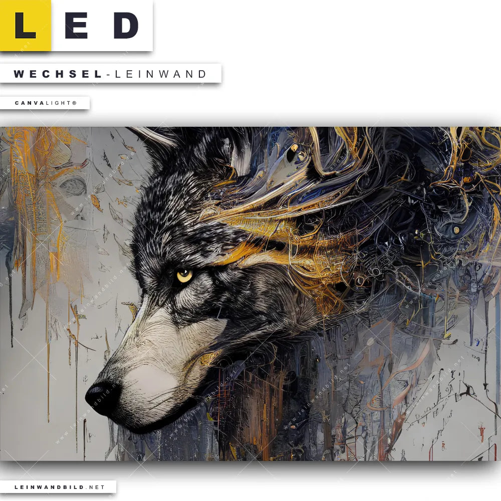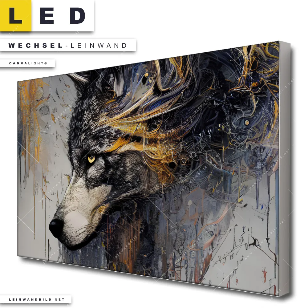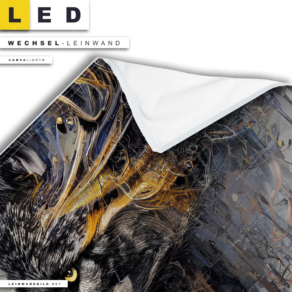 LED Wechsel-Leinwand Canvalight® TEX | Abstrakter Wolf in Gold und Grau | Querformat