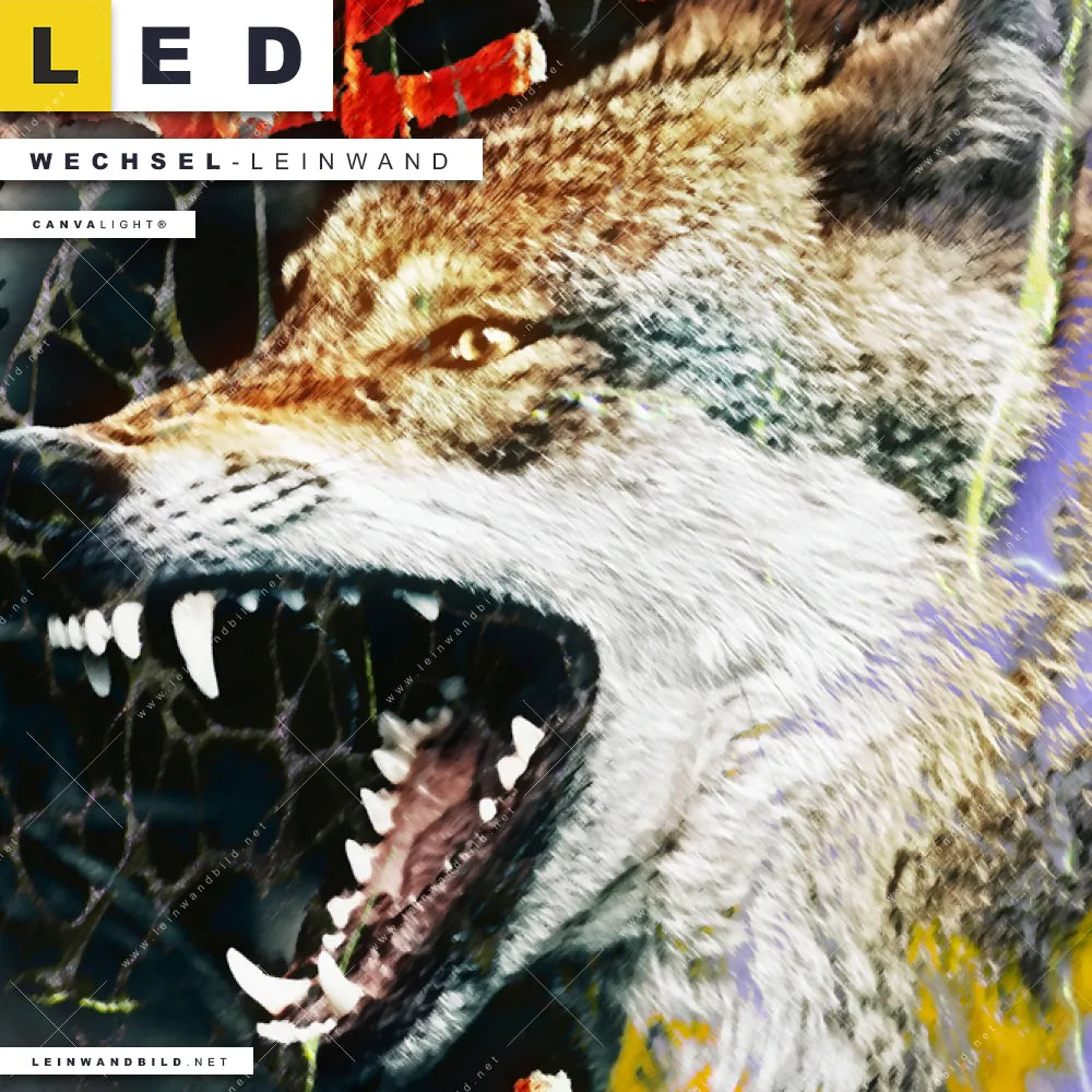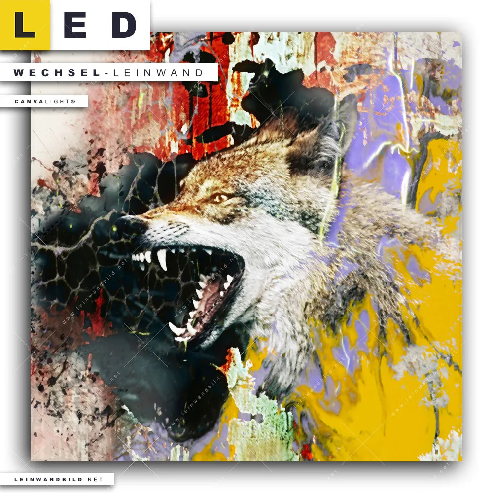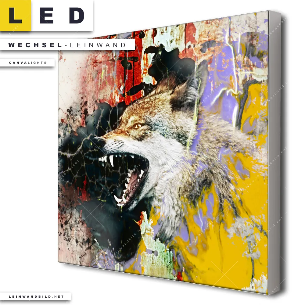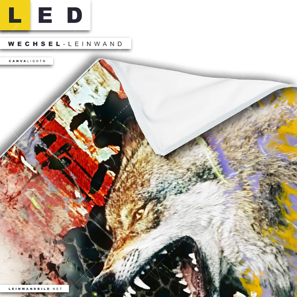 Bitte beachte, dass die Farben, der auf dem Monitor abgebildeten Expressives Wolf-Gemälde in lebhaften Farben Darstellung, möglicherweise von den Originalfarben deiner Canvalight® TEX Wechsel-Leinwand abweichen können.