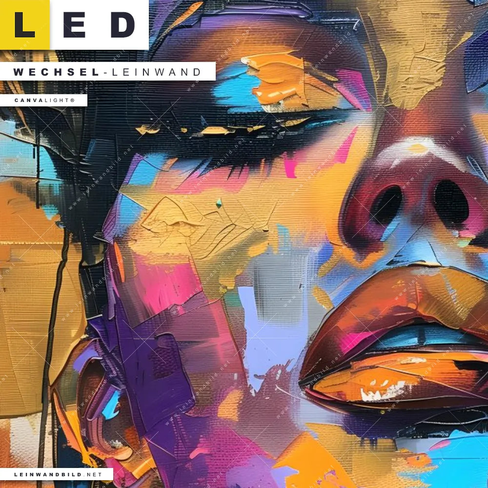 Du bist auf der Suche nach einer Porträts - Menschen Wechsel-Leinwand für Dein LED-Leinwandbild im Schmalen Format? Begriffe wie Kunst, Frau, Portrait, Gesicht, Mädchen, Dame, Acryl, Schönheit, Farbe haben Dich auf der Suche nach Deiner Ersatz-Leinwand für dein LED Wandbild im Panorama-Hochformat mit wechselbarer Leinwand inspiriert? Farben wie Orange, Schwarz, Blau, Weiss, Lila dürfen auf Deinem neuen Wechselmotiv für Dein XXL Leinwand-LED-Bild nicht fehlen und Leinwände im Abstrakt, Modern Art Stil für Leuchtbilder passen perfekt zu Deinem Einrichtungsstil?