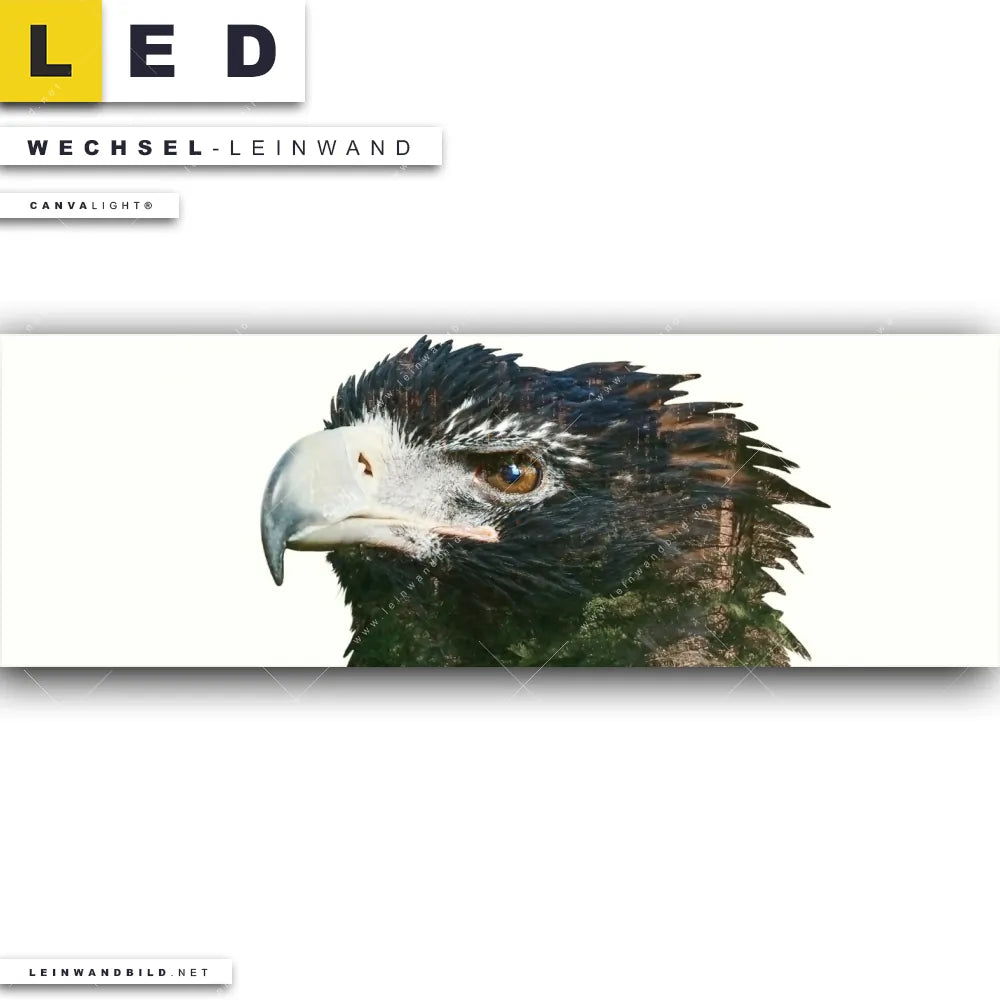 Du bist auf der Suche nach einer Tierwelt Wechsel-Leinwand für Dein LED-Leinwandbild im Panorama-Format? Begriffe wie Vogel, Adler, Wald, Doppelbelichtung, Natur, skandinavisch, Bäume haben Dich auf der Suche nach Deiner Ersatz-Leinwand für dein extra breites LED Wandbild mit wechselbarer Leinwand inspiriert? Farben wie Braun, Grün, Weiss dürfen auf Deinem neuen Wechselmotiv für Dein XXL Leinwand-LED-Bild nicht fehlen und Leinwände im Modern Art, Mixed Media Stil für Leuchtbilder passen perfekt zu Deinem Einrichtungsstil?