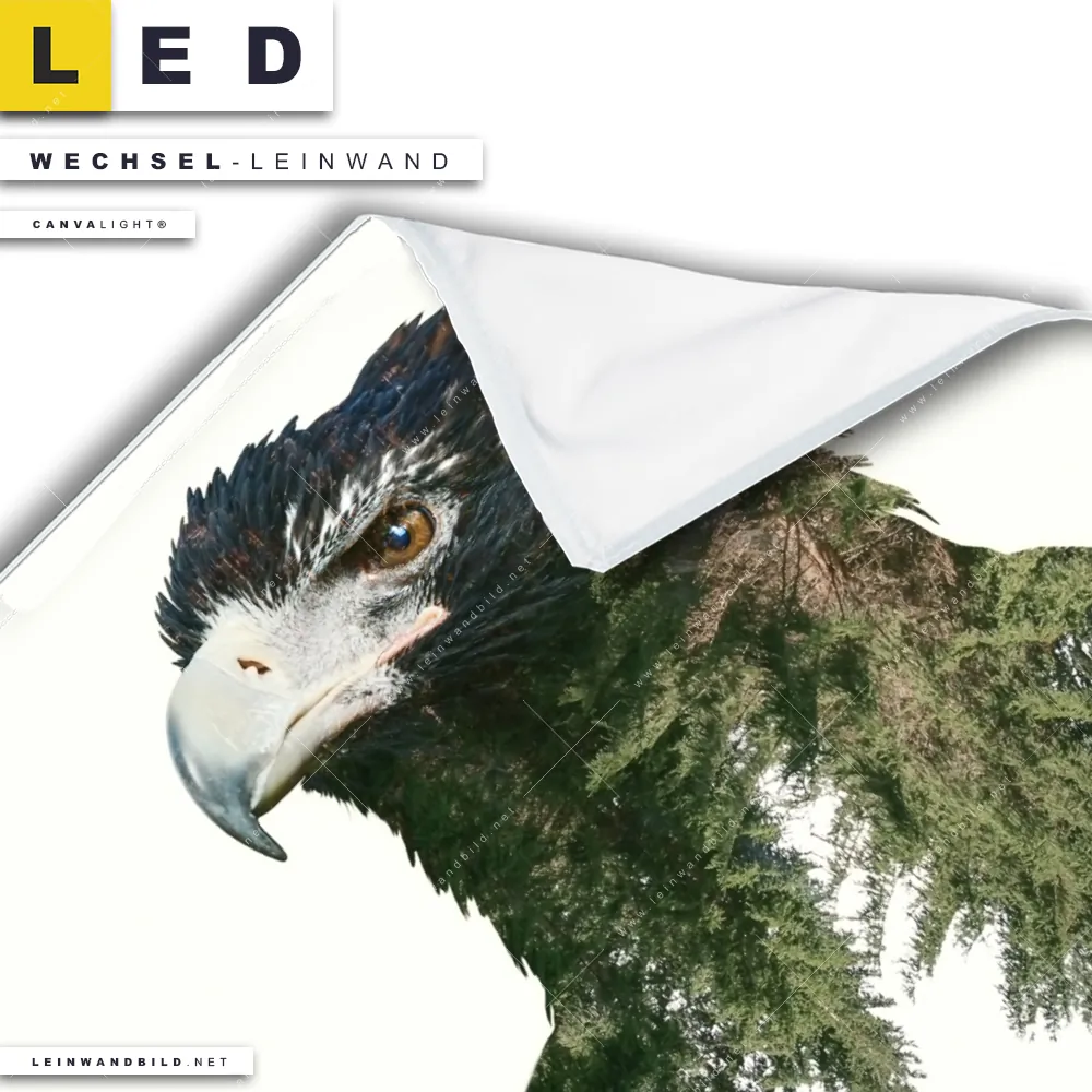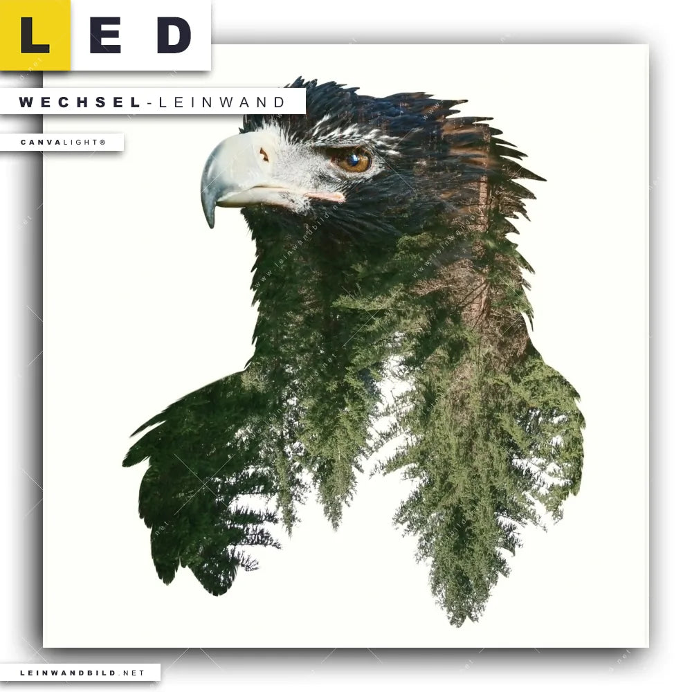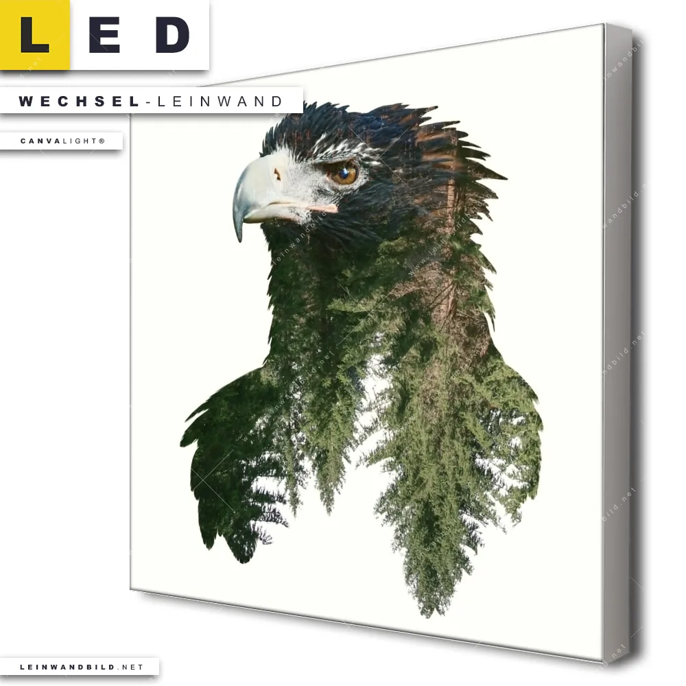 Du bist auf der Suche nach einer Tierwelt Wechsel-Leinwand für Dein LED-Leinwandbild im Quadratischen Format? Begriffe wie Vogel, Adler, Wald, Doppelbelichtung, Natur, skandinavisch, Bäume haben Dich auf der Suche nach Deiner Ersatz-Leinwand für dein LED Wandbild mit wechselbarer Leinwand inspiriert? Farben wie Braun, Grün, Weiss dürfen auf Deinem neuen Wechselmotiv für Dein XXL Leinwand-LED-Bild nicht fehlen und Leinwände im Modern Art, Mixed Media Stil für Leuchtbilder passen perfekt zu Deinem Einrichtungsstil?