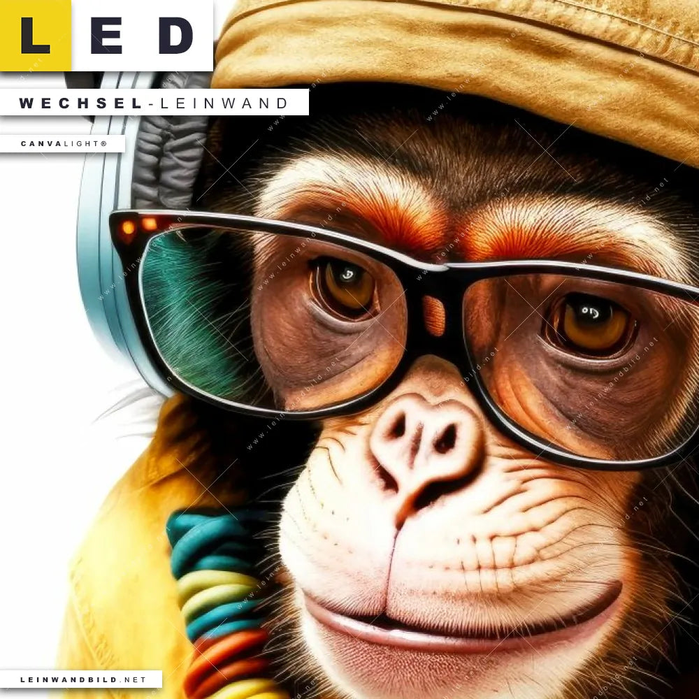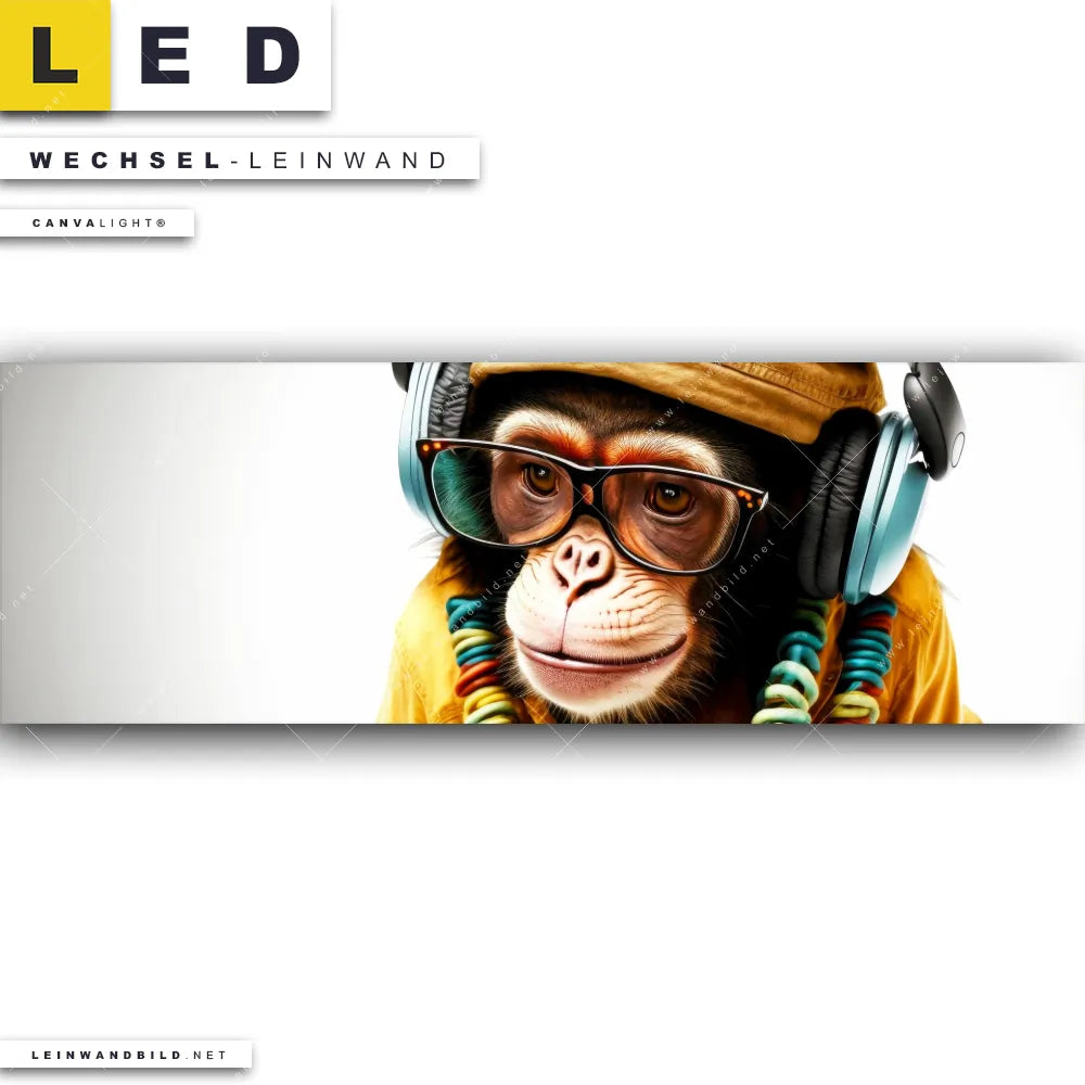 LED Wechsel-Leinwand Canvalight® TEX | Affe mit Kopfhörern & Brille | Panorama