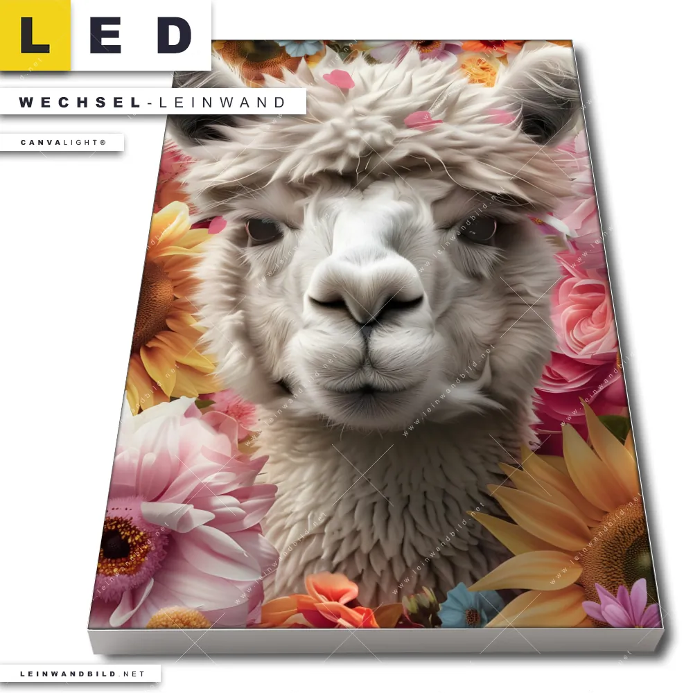 Du bist auf der Suche nach einer Tierwelt, Blumen - Botanik Wechsel-Leinwand für Dein LED-Leinwandbild im Hochformat? Begriffe wie Tier, Lama, Alpaka, Blumen, Blüten, Natur haben Dich auf der Suche nach Deiner Ersatz-Leinwand für dein LED Wandbild mit wechselbarer Leinwand inspiriert? Farben wie Beige, Rosa, Pink dürfen auf Deinem neuen Wechselmotiv für Dein XXL Leinwand-LED-Bild nicht fehlen und Leinwände im Floral, Surreal - Fantasy Stil für Leuchtbilder passen perfekt zu Deinem Einrichtungsstil?