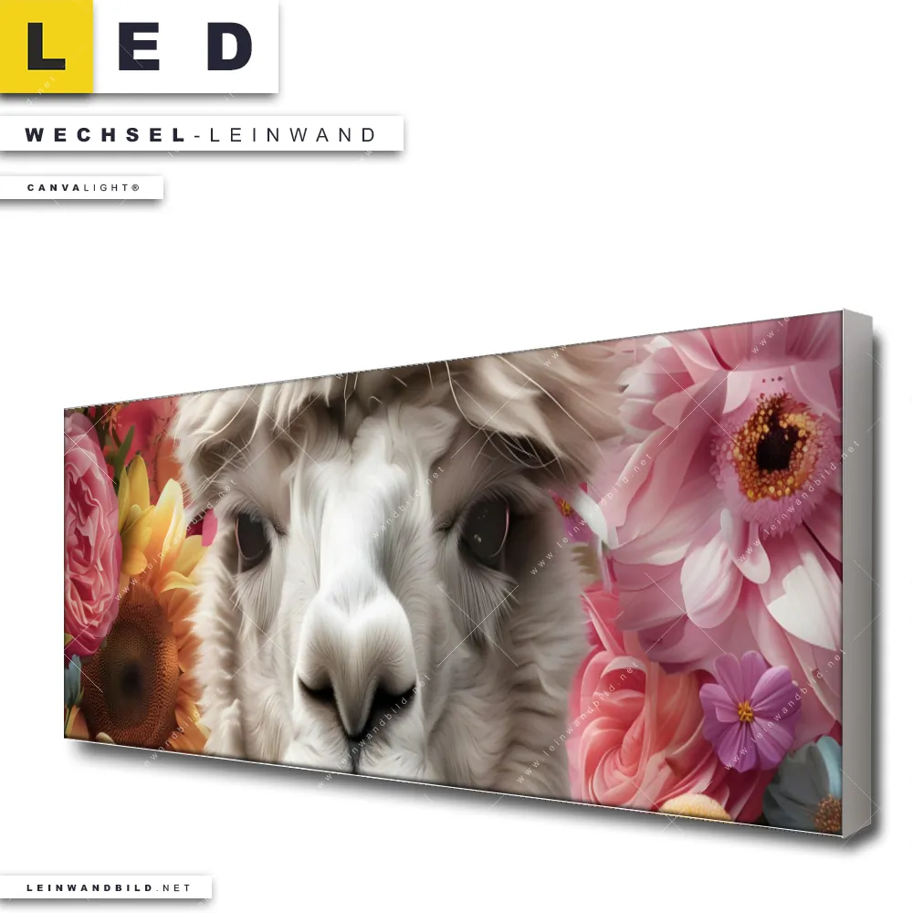Du bist auf der Suche nach einer Tierwelt, Blumen - Botanik Wechsel-Leinwand für Dein LED-Leinwandbild im Panorama-Format? Begriffe wie Tier, Lama, Alpaka, Blumen, Blüten, Natur haben Dich auf der Suche nach Deiner Ersatz-Leinwand für dein extra breites LED Wandbild mit wechselbarer Leinwand inspiriert? Farben wie Beige, Rosa, Pink dürfen auf Deinem neuen Wechselmotiv für Dein XXL Leinwand-LED-Bild nicht fehlen und Leinwände im Floral, Surreal - Fantasy Stil für Leuchtbilder passen perfekt zu Deinem Einrichtungsstil?